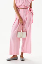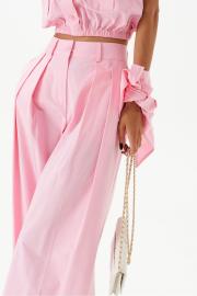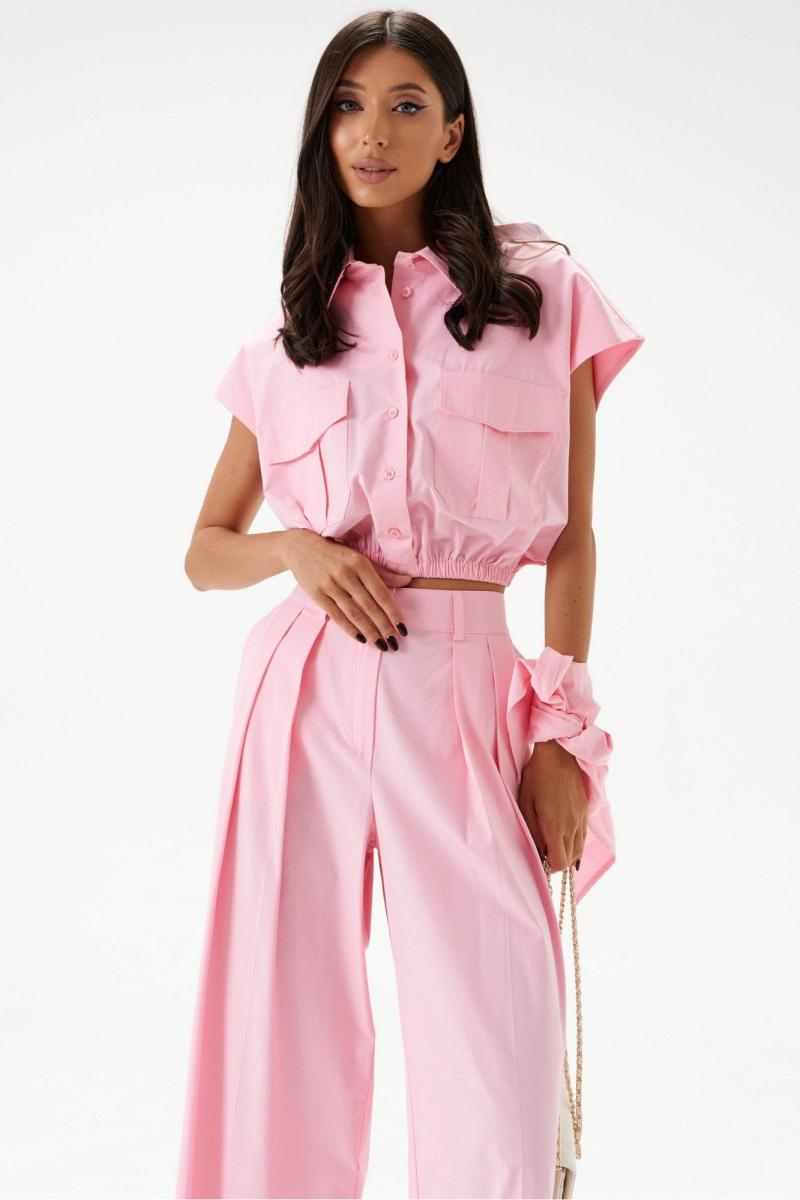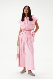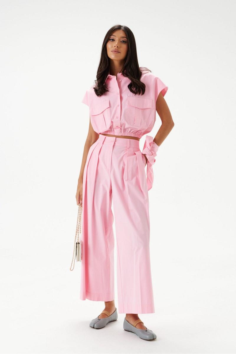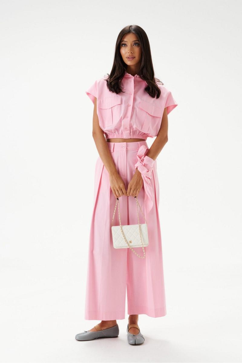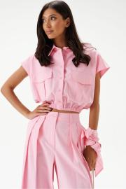 Блузка укороченная, без рукавов, выполнена из хлопкового полотна нежно-розового цвета. Характеристики: воротник рубашечного типа, застежка на пуговицы, по переду накладные карманы с клапонами, низ присборен на резинку. В комплект прилагается шарф из основной ткани изделия. Длинна по спинке 46 см.