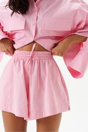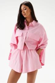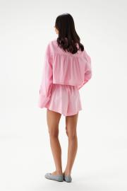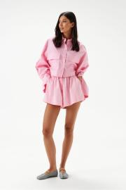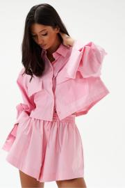 Рубашка прямого свободного кроя выполнена из хлопкового полотна розового цвета. Характеристики: отложной воротник, застежка центральная на петли пуговицы, рукав расклешен - спущен, по переду нашиты карманы с клапоном, по низу рукава широкая манжета на пуговице, спинка отрезная с декоративной сборкой. Длина спинки 44 см, длина рукава от края горовины 79 см.