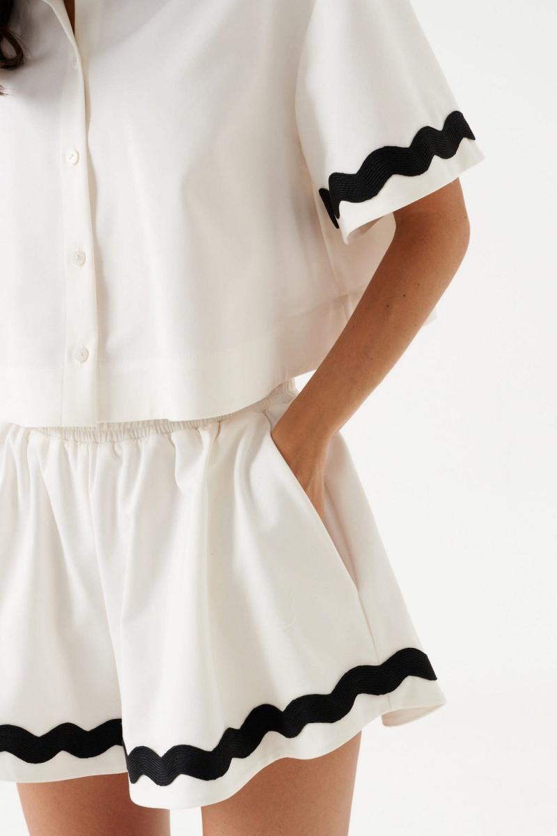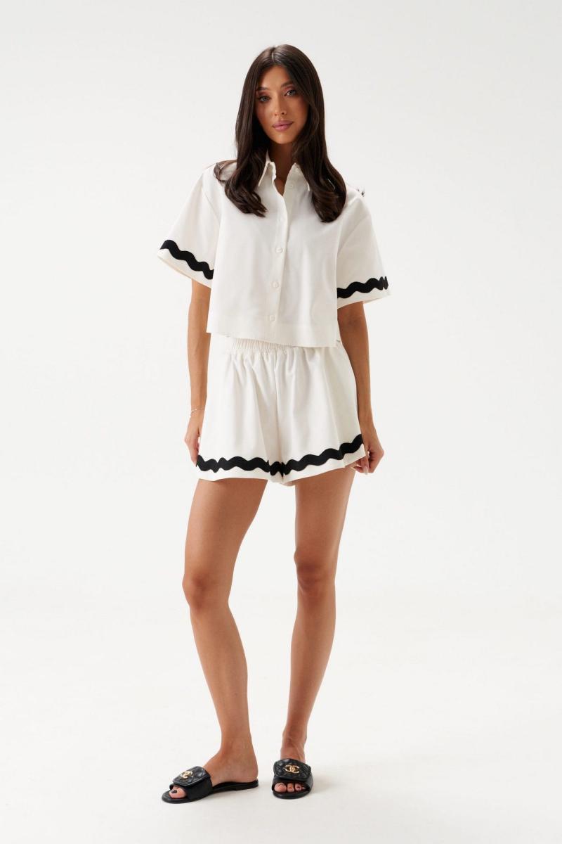 Рубашка прямого свободного кроя выполнена из текстильного полотна белого цвета с черной декоративной рюшей.Характеристики: прямой крой с разведением к низу, отложной воротник, застежка центральная на петли пуговицы, рукав свободного кроя с разведением к низу - втачной. Длина по спинке 44см, длина рукава 21см.
