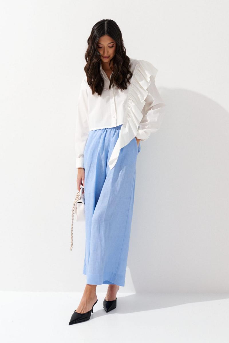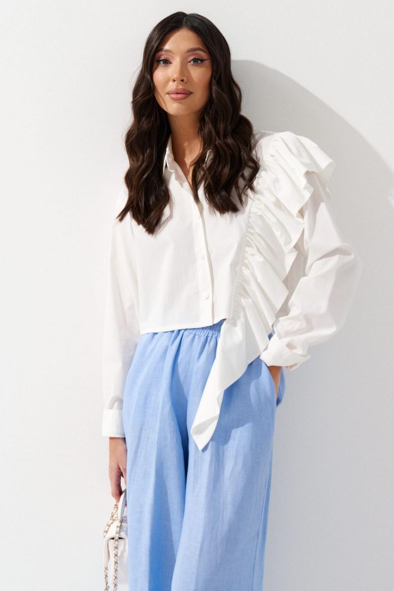 Рубашка прямого кроя выполнена из хлопкового полотна белого цвета. Характеристики: прямой крой, отложной воротник на стойке, застежка центральная на петли пуговицы, рукав втачной, по низу рукава манжета на пуговичке, по левой стороне нашит волан переходящий на спинку, выполнен из ткани основного изделия. Длина по спинке 44 см, длина рукава 60 см.