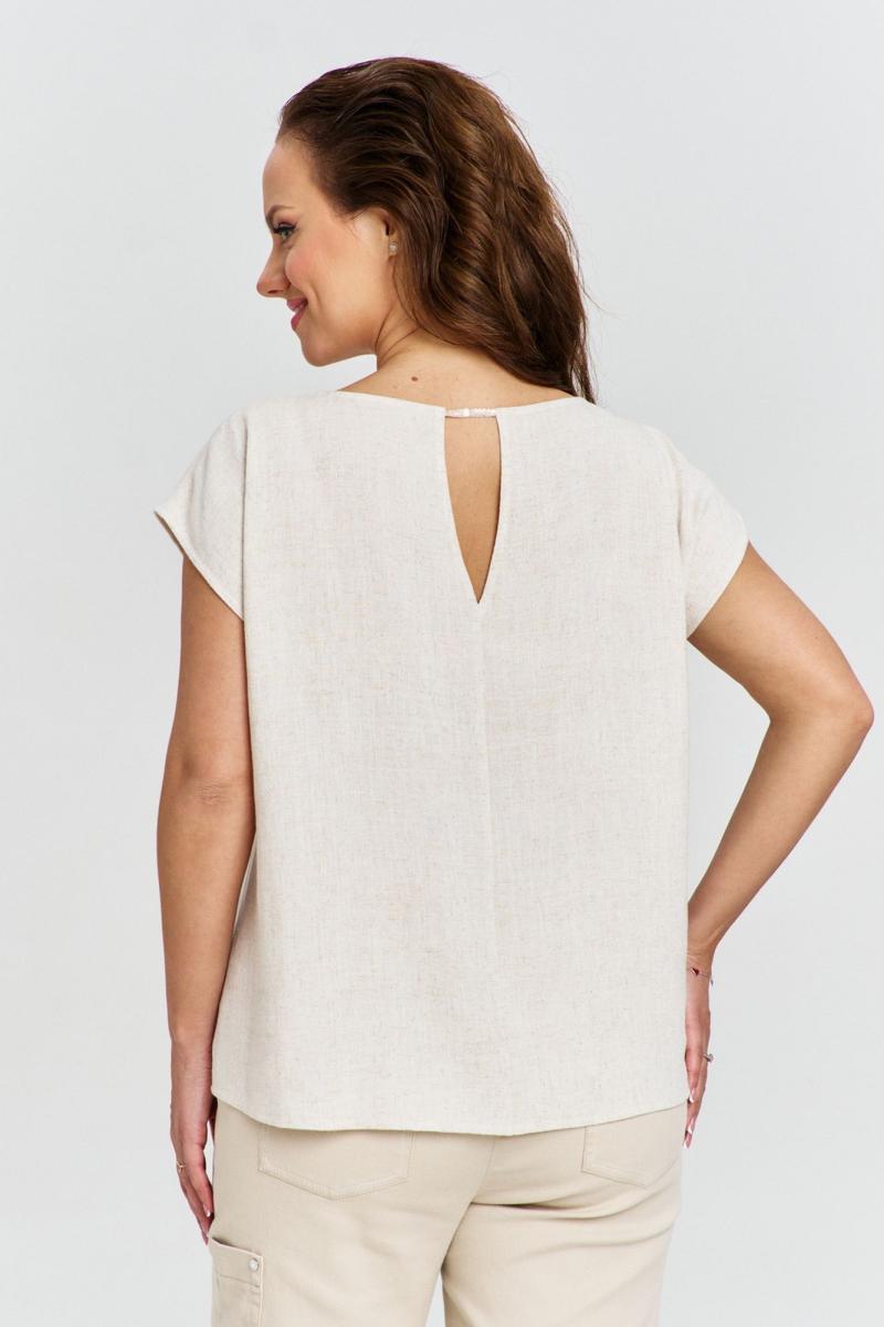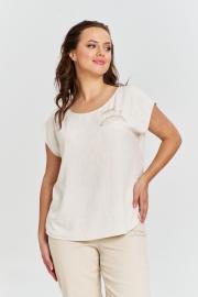 Топ из мягкой струящейся ткани, прямого силуэта, с круглой горловиной и спущенной линией плеча. На переде авторская вышивка с применением золотистой пайетки. Спинка со средним швом и декоративным вырезом по горловине.