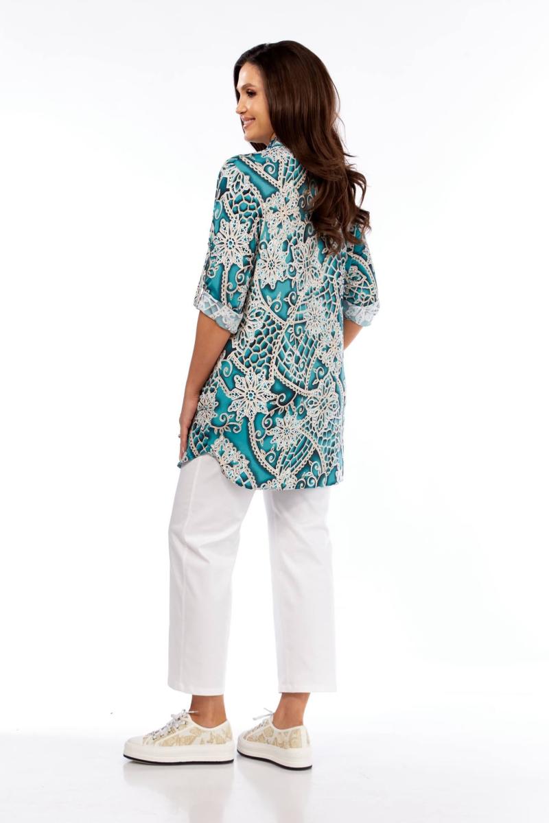 Блузка свободного покроя с втачным рукавом 7/8 длины с патой, воротник рубашечный на стойке, с планками под застёжку на пуговицы.
