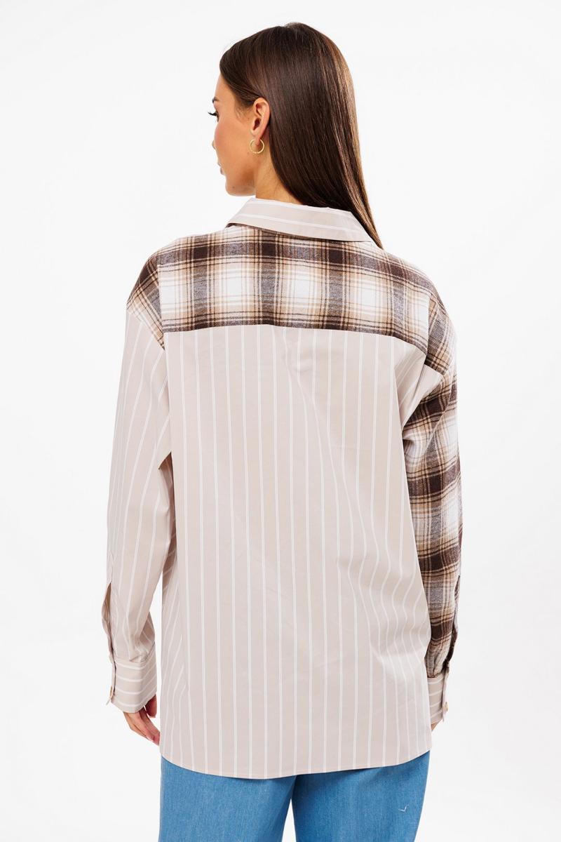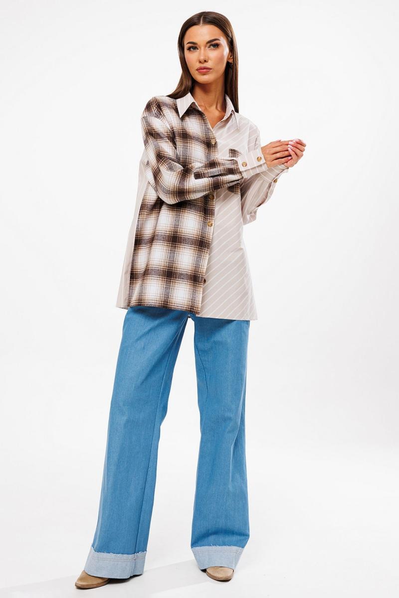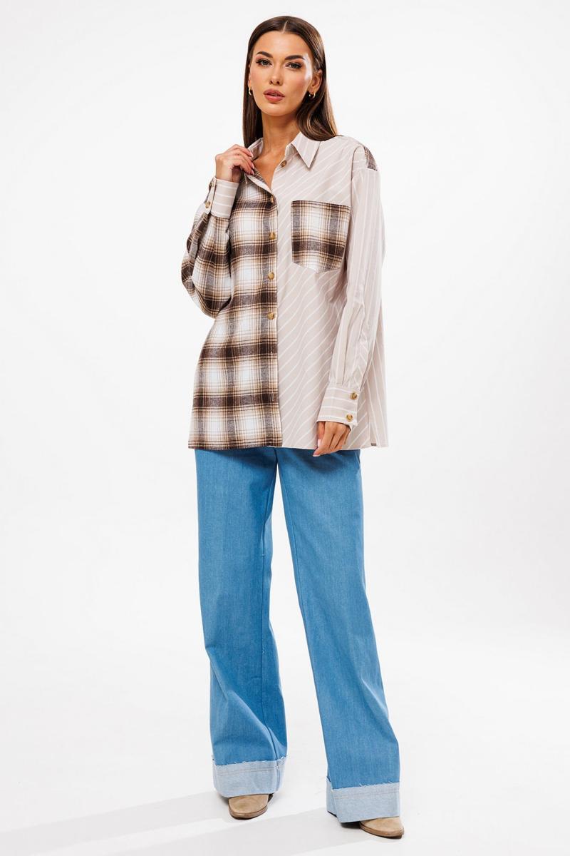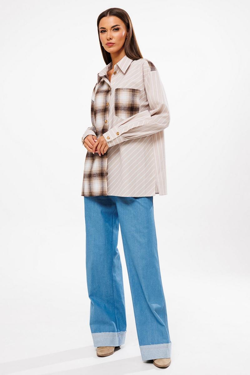 Блузка прямого силуэта, двухцветная. Рукав втачной одношовный, внизу со складкой и манжетой, с застежкой на петли-пуговицы. Полочка с центральной застежкой на петли-пуговицы. По левой полочке нагрудный карман. Воротник рубашечный отложной на стойке. По спинке кокетка. Внизу по боковым швам обработаны разрезы.