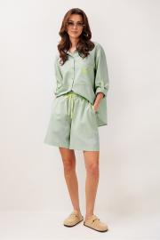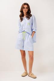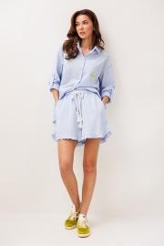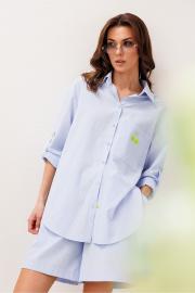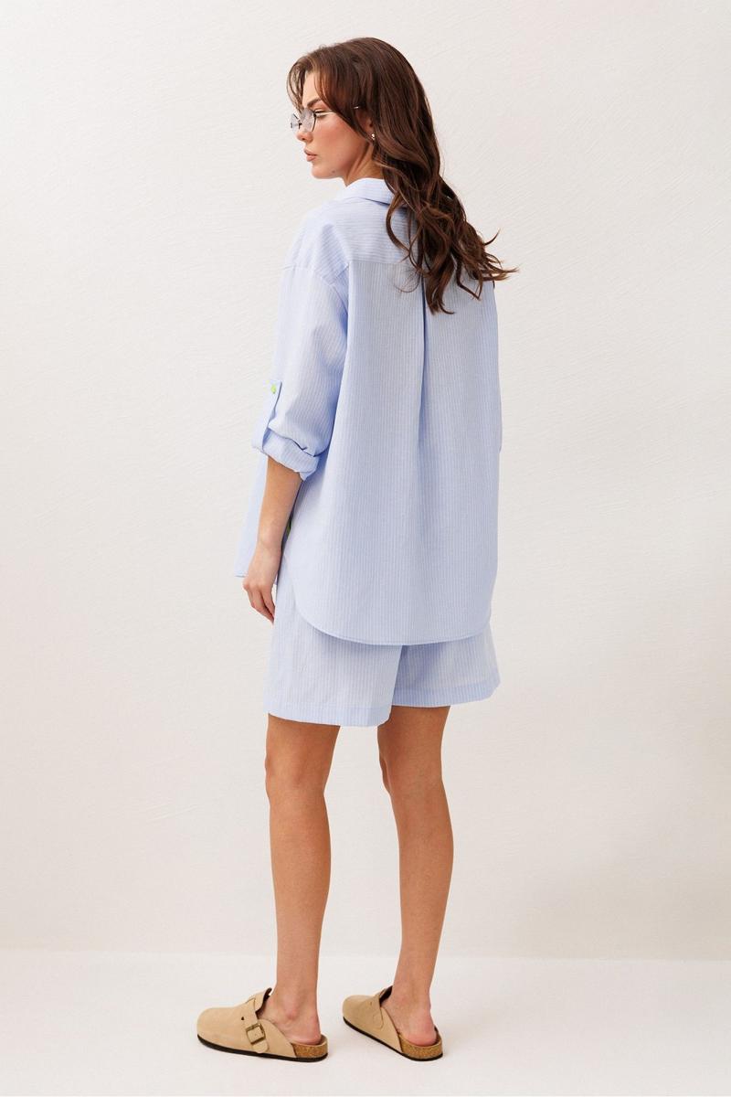 Блузка прямого силуэта, с втачным одношовным рукавом с патой, внизу со складкой и манжетой с застежкой на петлю-пуговицу. Полочка с центральной застежкой по планке на петли-пуговицы. По переду настрочен карман с печатью "Cherry". По спинке кокетка и встречная складка от кокетки. Воротник рубашечный отложной на стойке. Спинка и полочка с фигурным низом. Внизу по боковым швам обработаны разрезы.