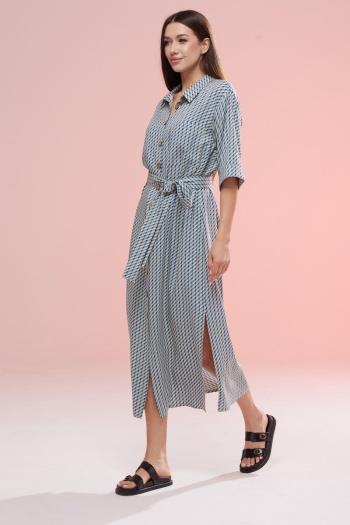 Блузка из мягкой экокожи, прямого силуэта, длиной до середины, со спущенной линией плеча, с рукавами, длиной до запястья. Горловина округлой формы, с рубашечным воротником, застёжка центральная на пробивные кнопки на притачной планке. На деталь переда слева, на уровне груди, настрочен фигурный карман. Спинка с отрезной кокеткой и бахромой по шву притачивания кокетки, переходящей в локтевой шов. По низу рукавов, по шву притачивания манжет заложена складка, застёжка манжет на пробивную кнопку. Низ блузки прямой. Низ блузки обтачной фигурный, со скруглёнными разрезами по боковым швам, закреплён отделочной строчкой. По краю воротника, карману, планкам, манжетам, поясу, по шву притачивания кокетки и локтевым швам прострочена широкая отделочная строчка. В верхнем левом углу кармана пришивной логотип. На талии расположен съёмный пояс.