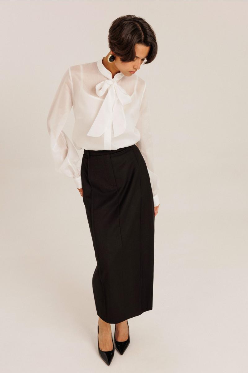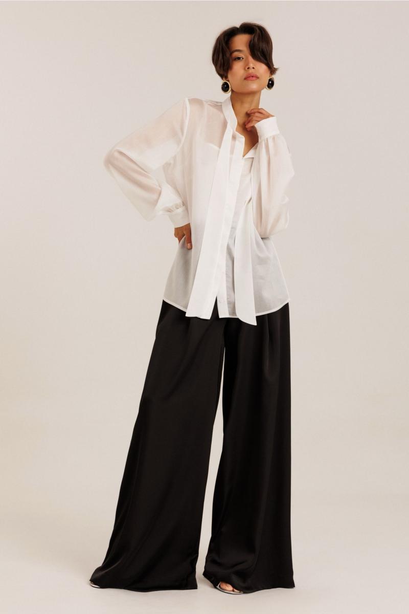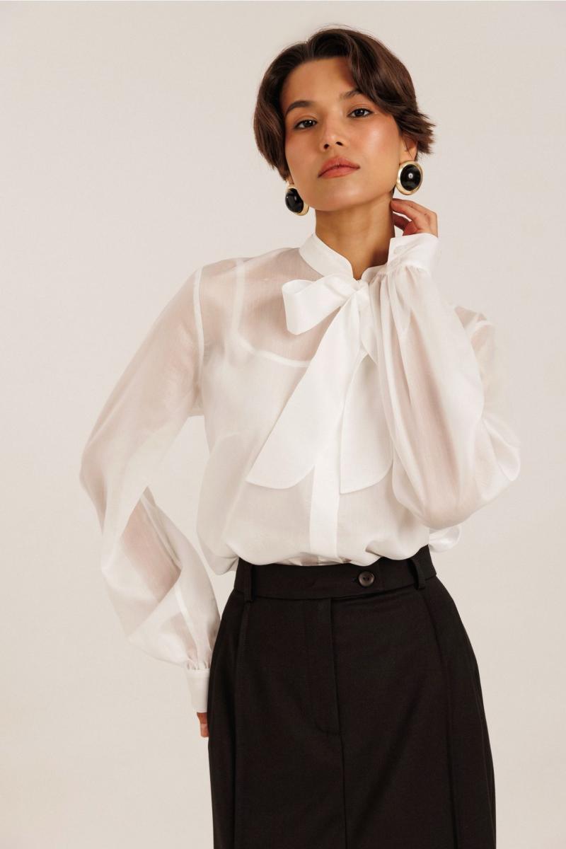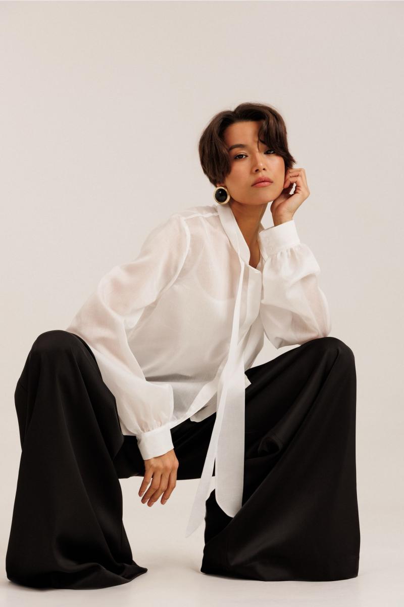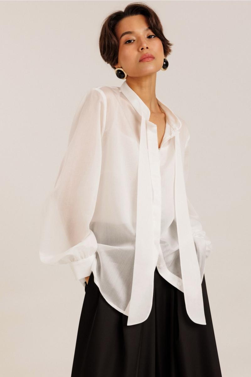 Блузка женская выполнена из полупрозрачного лиоцела. По горловине изделия выполнена стойка. Рукав длинный. Застежка потайная на пуговицах. В комплекте с блузкой идет топ на регулируемых бретелях