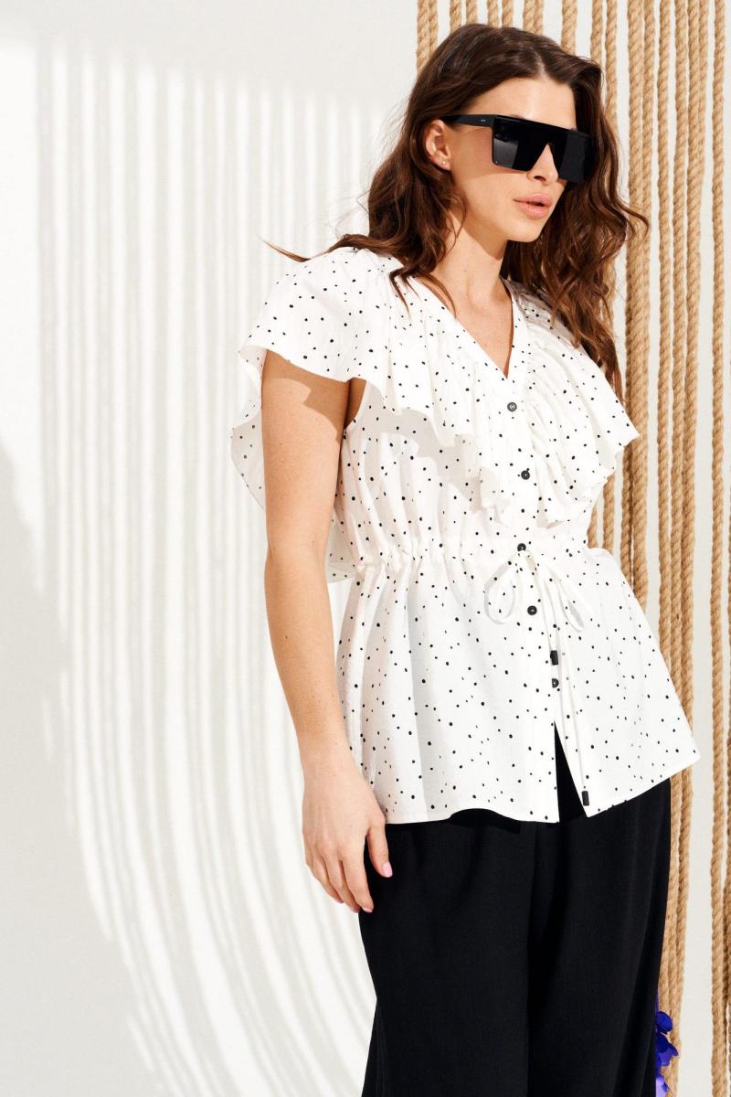 Блузка умеренного объема, приталенного силуэта, с V-образным вырезом горловины и центральной застежкой на петли и пуговицы. Детали переда с нагрудными вытачками. Спинка с рельефами от плечевого шва до низа. Горловина переда и рельефы спинки оформлены воланами. Для регулировки приталенности линия талии оформлена кулиской со шнуром-завязкой и наконечниками. Длина изделия на модели вдоль середины спинки — 65,5 см (допустимое отклонение +/- 1 см)
