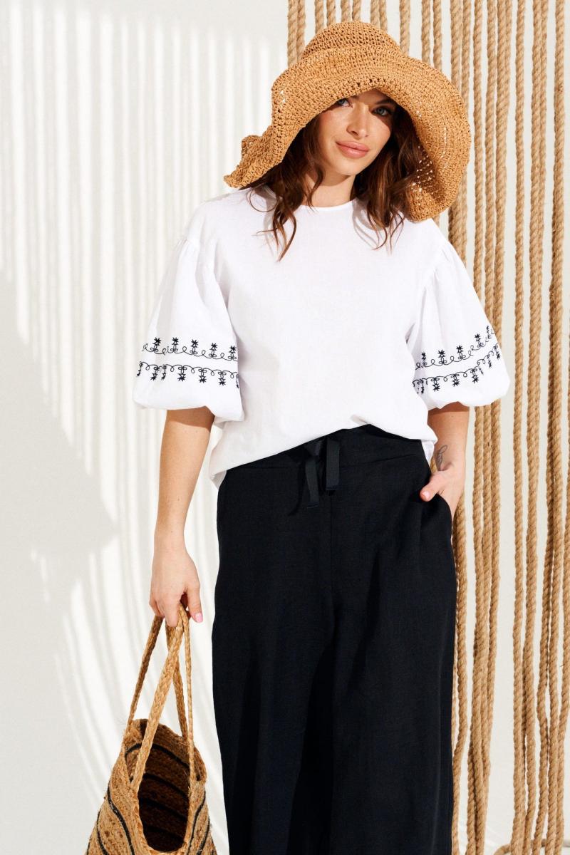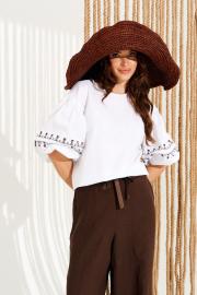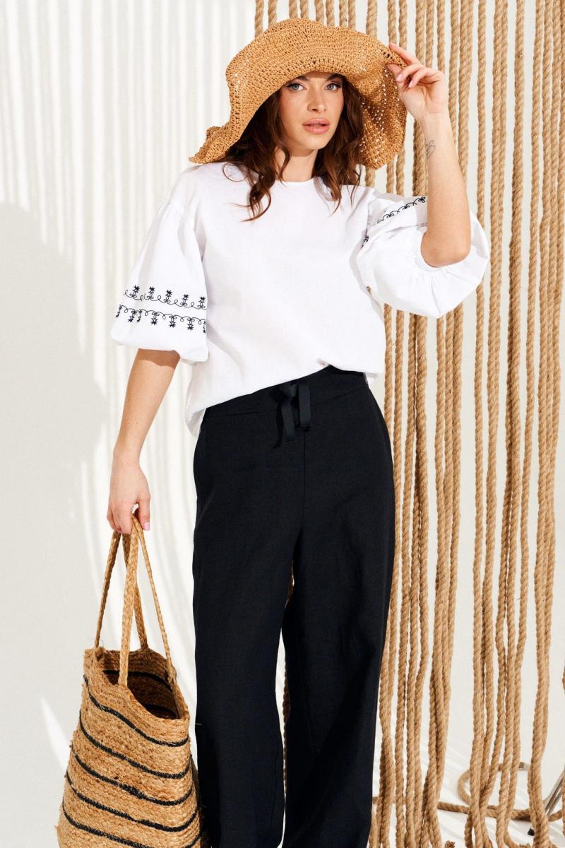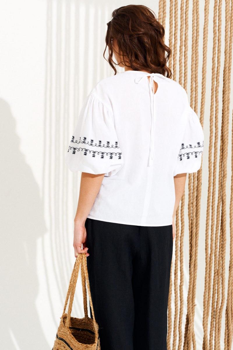 Блуза умеренного объема, прямого силуэта, с круглым вырезом горловины. Горловина обработана окантовкой, переходящей в завязки на спинке. Спинка со средним швом. Рукав втачной, одношовный, короткий, с вышивкой «Тесьма». Нижний срез рукава обработан притачной манжетой. Длина изделия на модели вдоль середины спинки — 61 см (допустимое отклонение +/- 1 см)