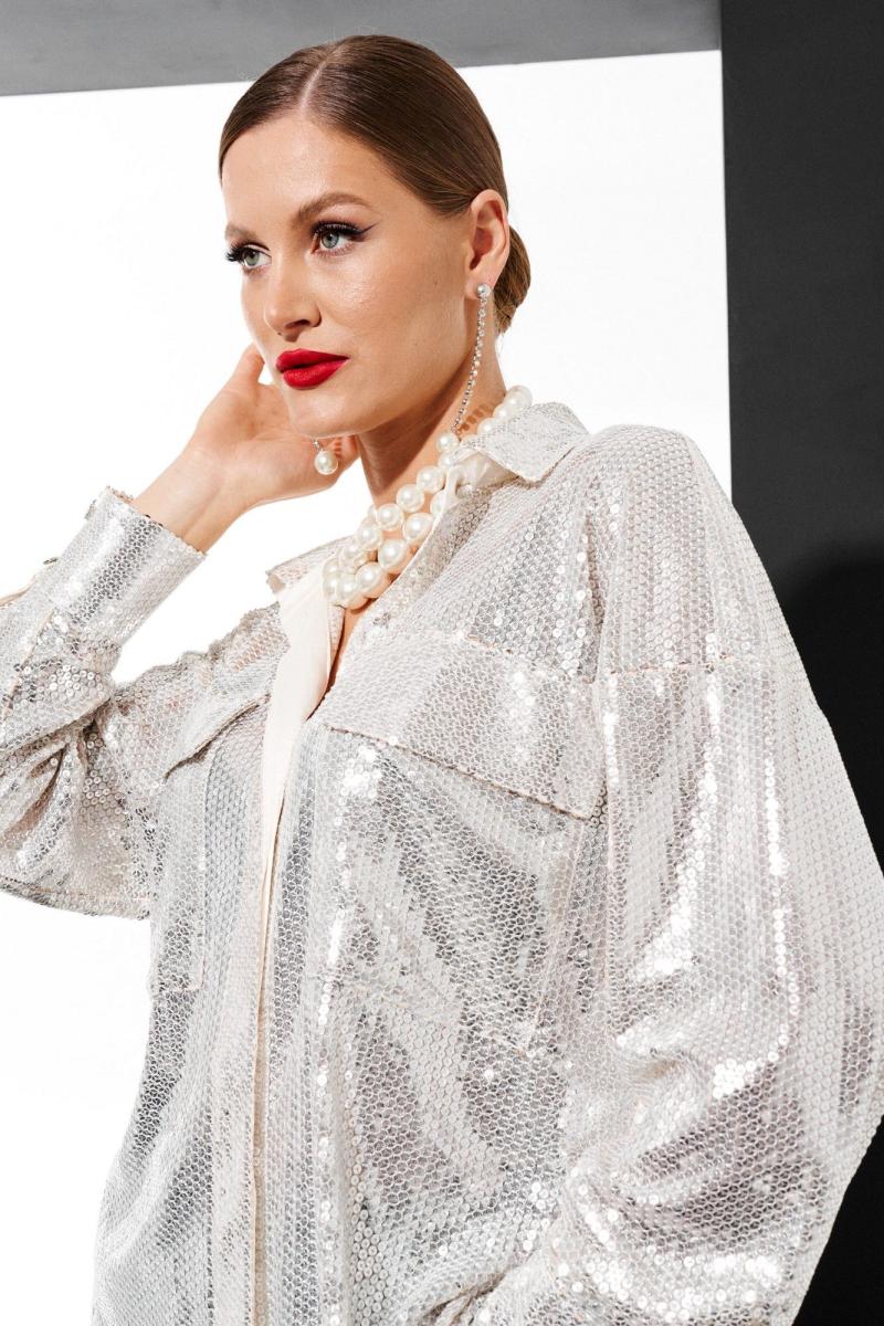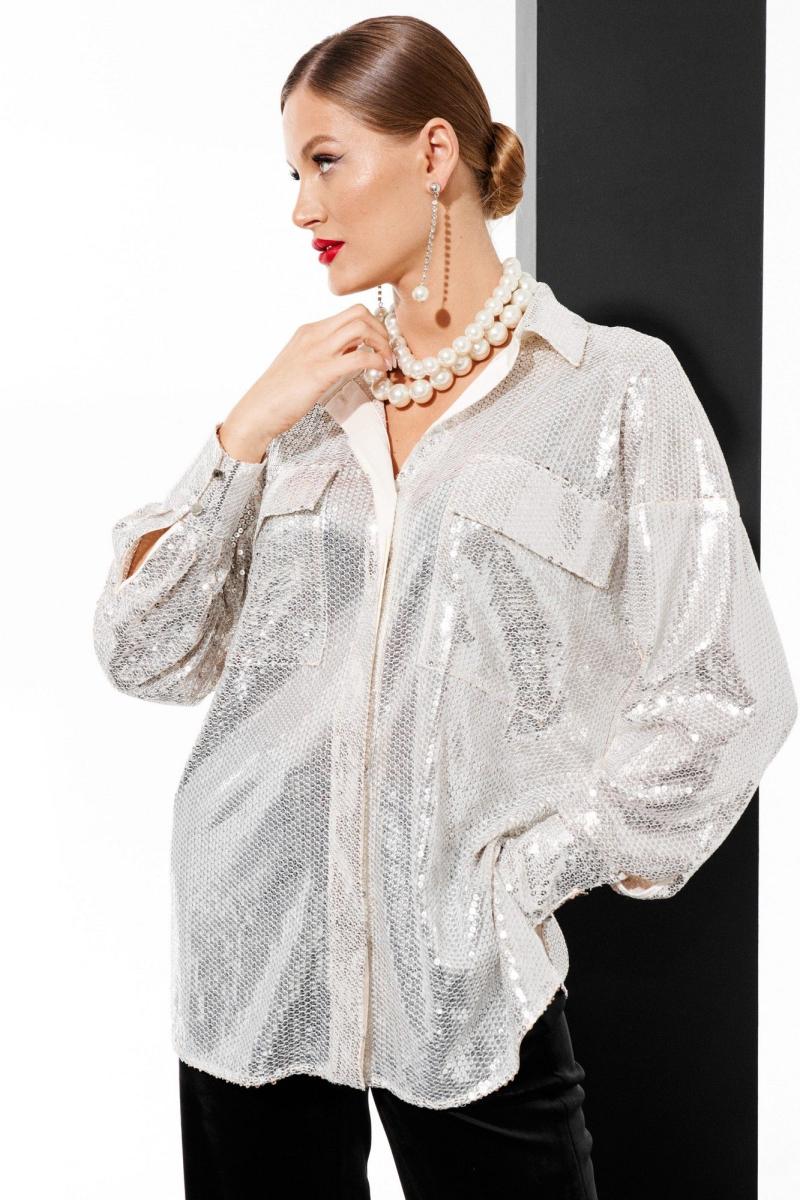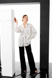 Блузка женская, прямого силуэта, длиной до середины линии бедер, со спущенной линией плеча. Перед с нагрудными вытачками, накладными карманами, цельнокроенной планкой, застежкой на петли-пуговицы. Рукав втачной, одношовный, длинный, на притачной манжете с застежкой на петли-пуговицы. Воротник рубашечный на отрезной стойке.