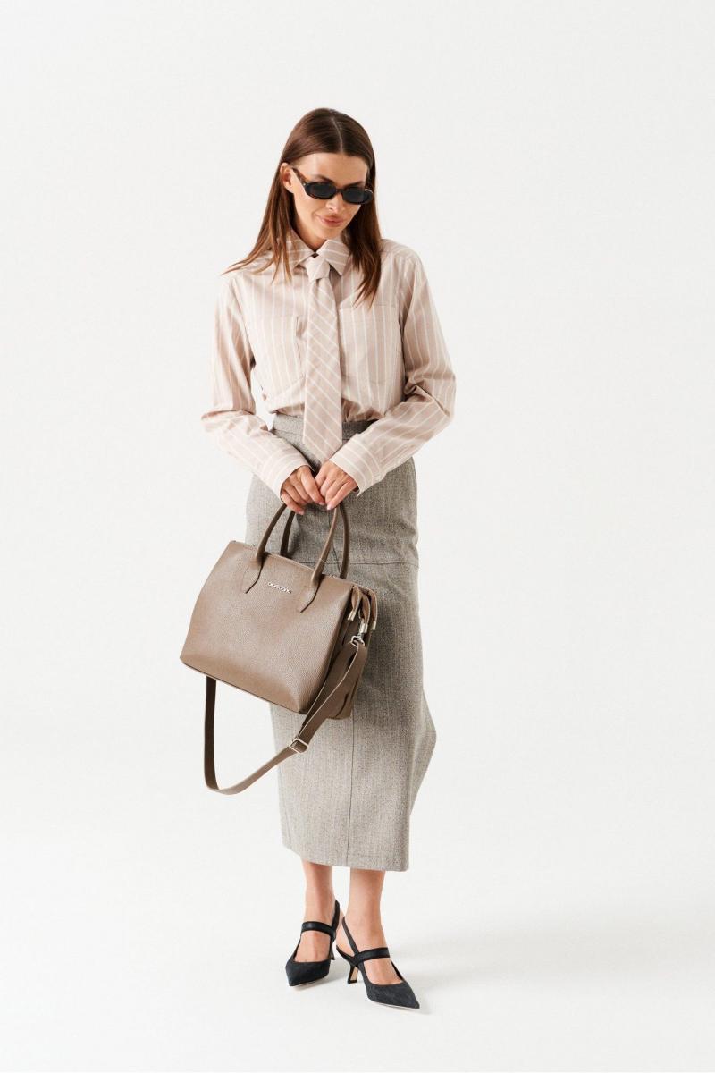 Блузка-рубашка прямая, свободная, с центральной застежкой на петли и пуговицы. Воротник рубашечный, отложной, на притачной стойке. По полочкам в верхней части – симметричные накладные карманы. Спинка цельная. Боковые швы заканчиваются разрезом. Рукав втачной, длинный, с отрезной манжетой, застежкой на петли и пуговицы. В комплекте съемный галстук.