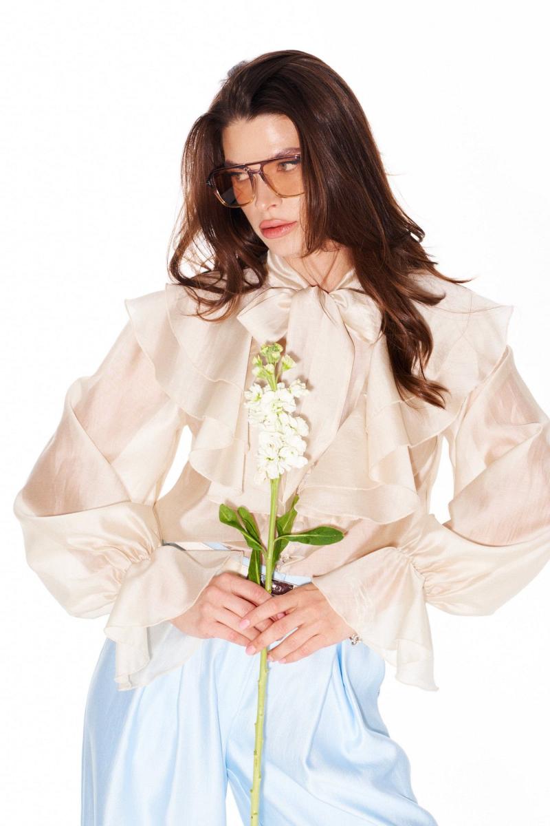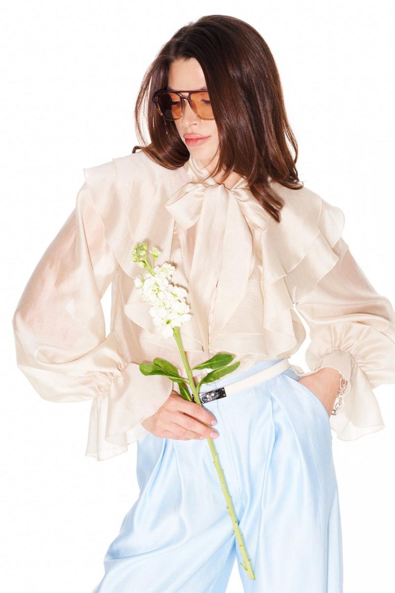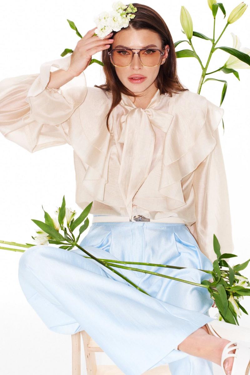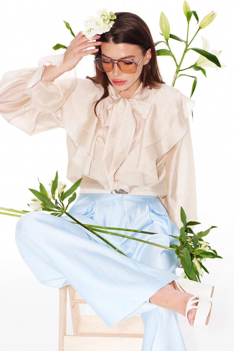 Блузка умеренного объема, прямого силуэта, с центральной застежкой на навесные петли и пуговицы. Воротник с отрезной стойкой, переходящий в завязки. Горловина переда оформлена V-образным вырезом. Детали переда с рельефами, оформленные воланами. Спинка цельная. Рукав покроя реглан. Нижний срез рукава обработан воланом и собран на резинку.