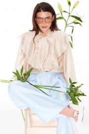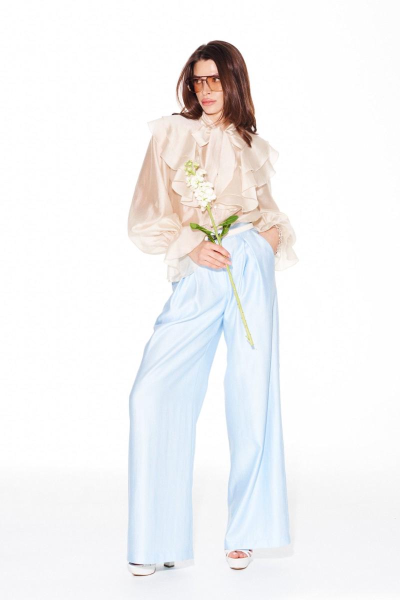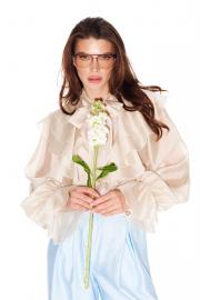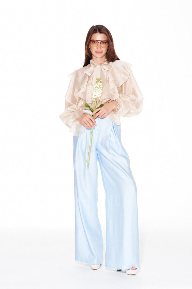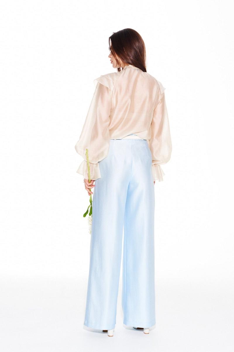 Блузка умеренного объема, прямого силуэта, с центральной застежкой на навесные петли и пуговицы. Воротник с отрезной стойкой, переходящий в завязки. Горловина переда оформлена V-образным вырезом. Детали переда с рельефами, оформленные воланами. Спинка цельная. Рукав покроя реглан. Нижний срез рукава обработан воланом и собран на резинку.