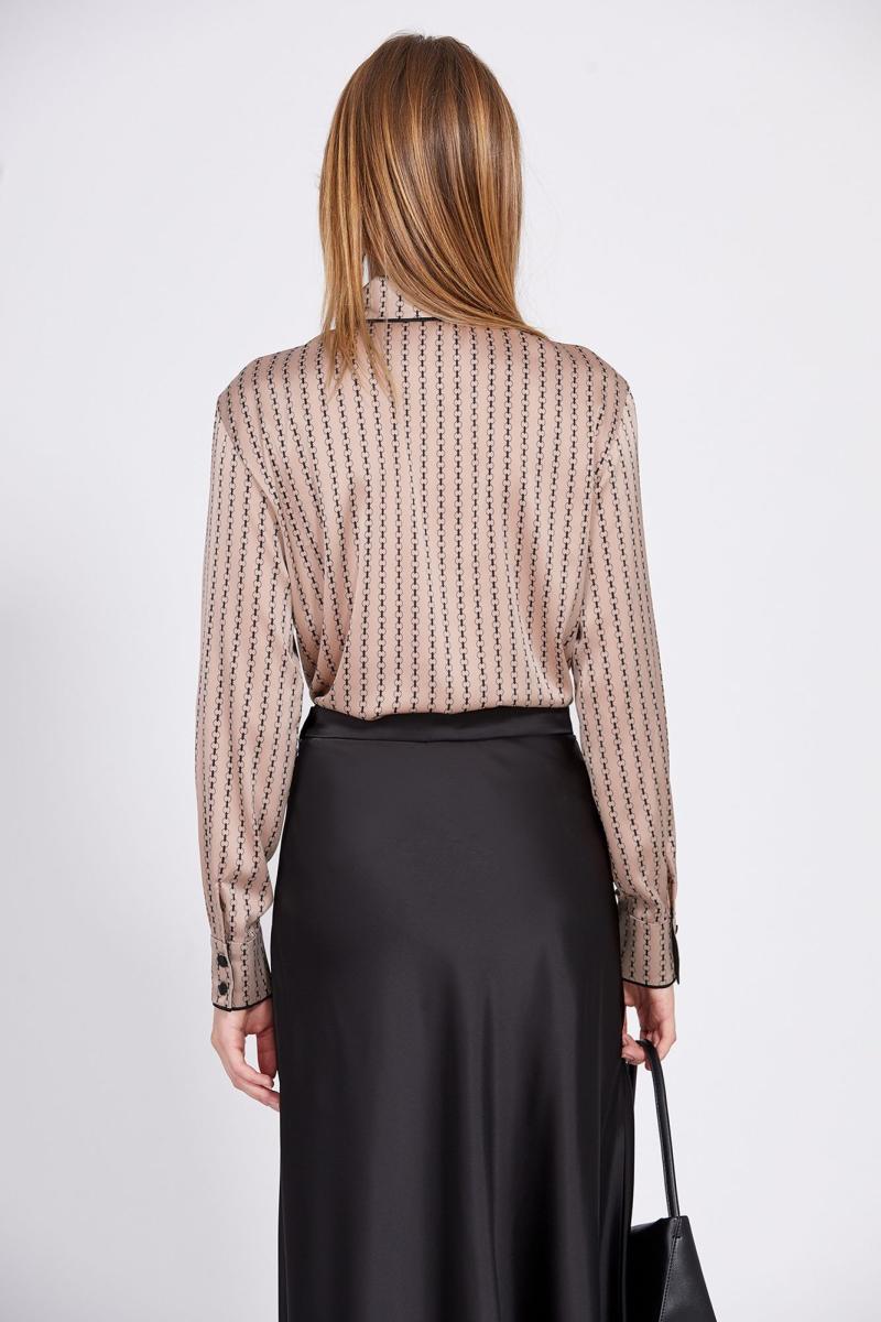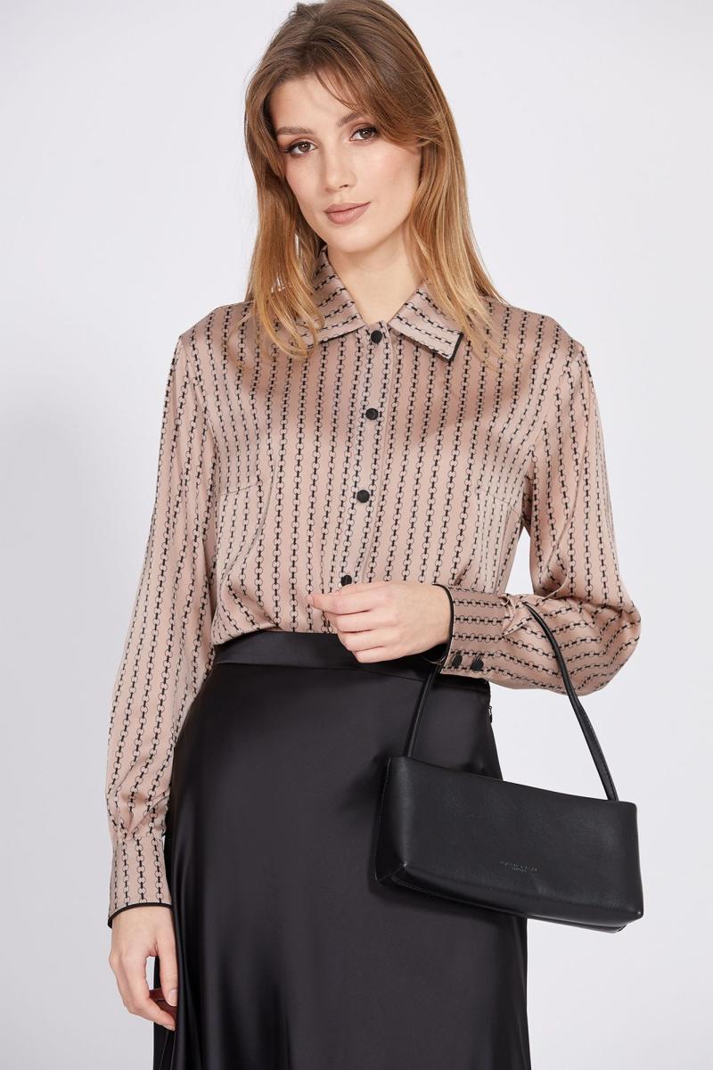 Блузка выполнена из атласа. Блузка прямого силуэта, длиной до линии бедер. Спереди застежка на пуговицы. Воротник стояче-отложной. Плечевой шов удлинен. Рукав одношовный с прорезью и двумя складками по низу. Низ рукава на притачной манжете, застегивающейся на две пуговицы. В боковых швах разрезы.