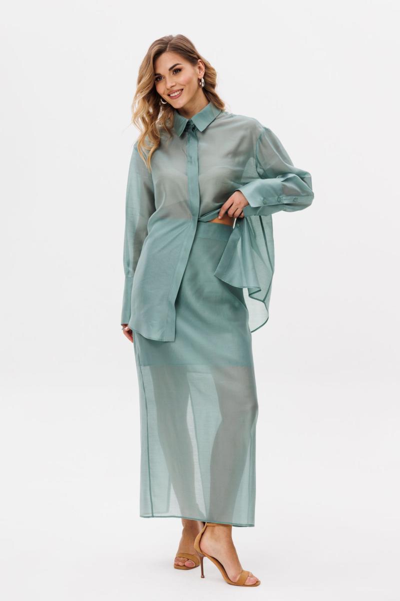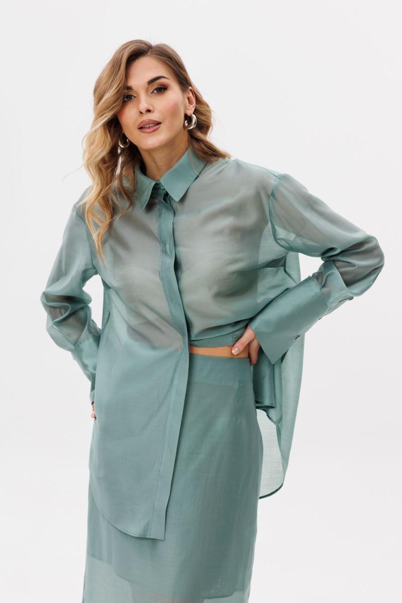 Блузка выполнена из плательно-блузочной ткани. Блузка прямого силуэта, длиной ниже линии бедер. Спереди застежка на пуговицы и потайную планку. Спинка цельная. Воротник стояче-отложной. Плечевой шов удлинен. Рукав рубашечного покроя, одношовный. Низ рукава на притачной манжете. Низ блузки фигурной формы. Длина блузки: р. 44-48 - 78 см, р. 50-54 - 79,5 см.