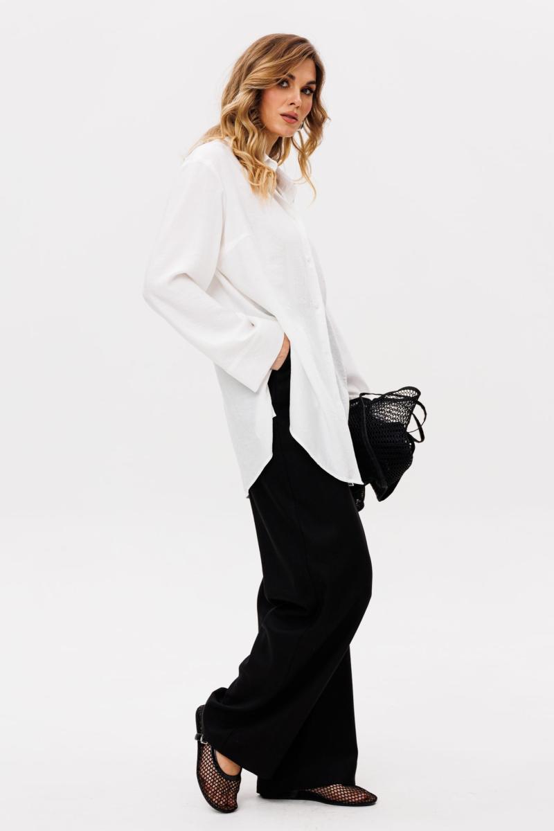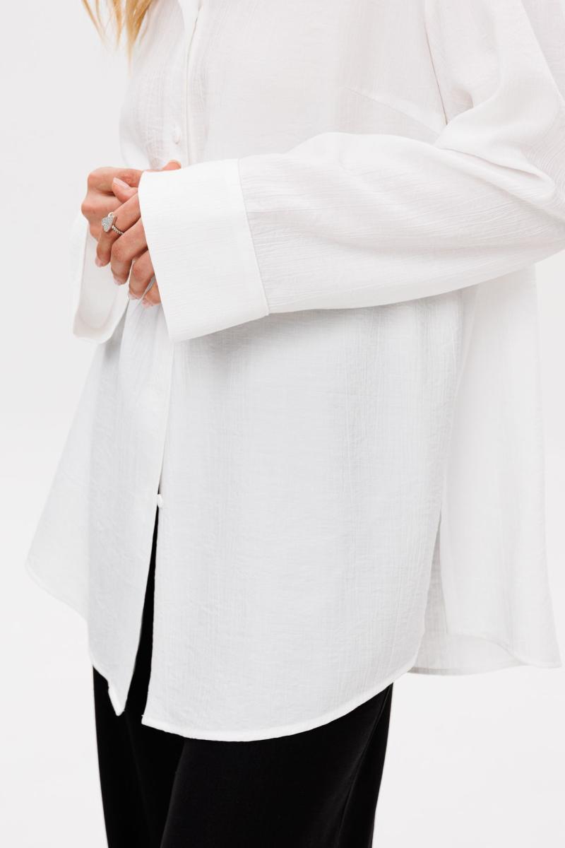 Блузка выполнена из плательно-блузочной ткани. Блузка прямого силуэта, длиной ниже линии бедер. Спереди центральная застежка на пуговицы. Спинка цельная. Вортник стояче-отложной с отрезной стойкой. Плечевой шов удлинен. Рукав рубашечный, одношовный. Низ рукава на широкой манжете. В боковых швах разрезы. Низ блузки фигурной формы. Топ в комплект не входит, можно приобрести отдельно арт. 2855. Длина блузки: р. 42-46 - 78,5 см, р. 48-52 - 79,5 см. Длина рукава: р. 42-46 -76 см, р. 48-52 - 77 см.