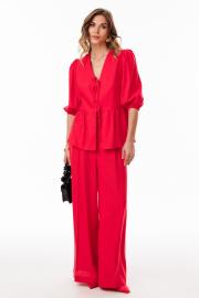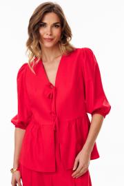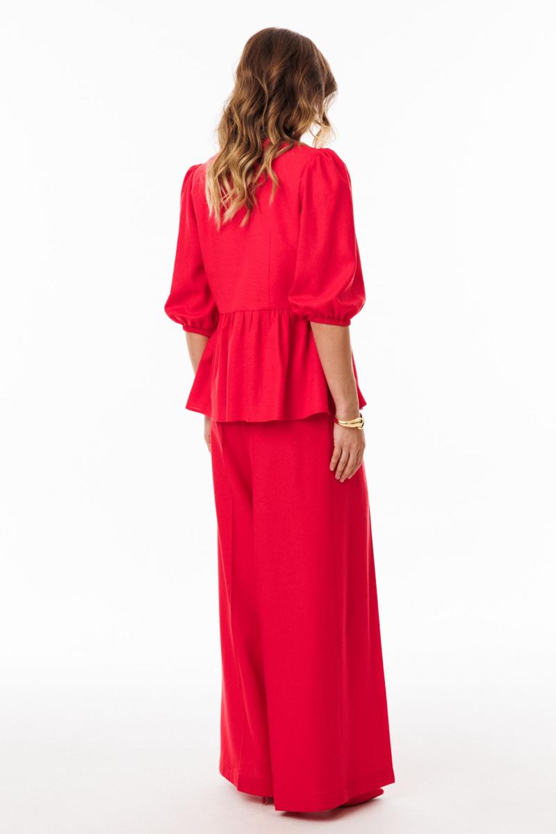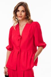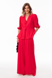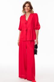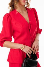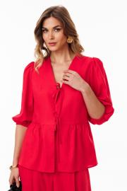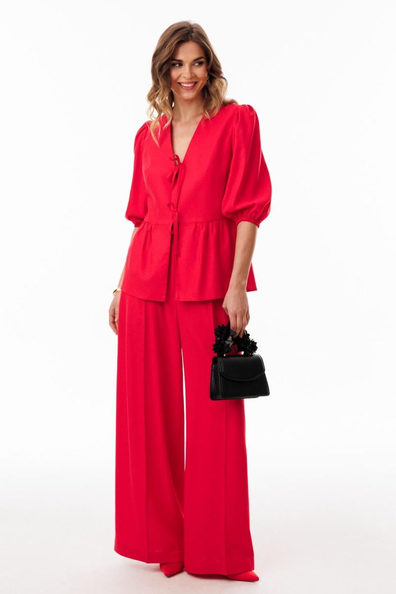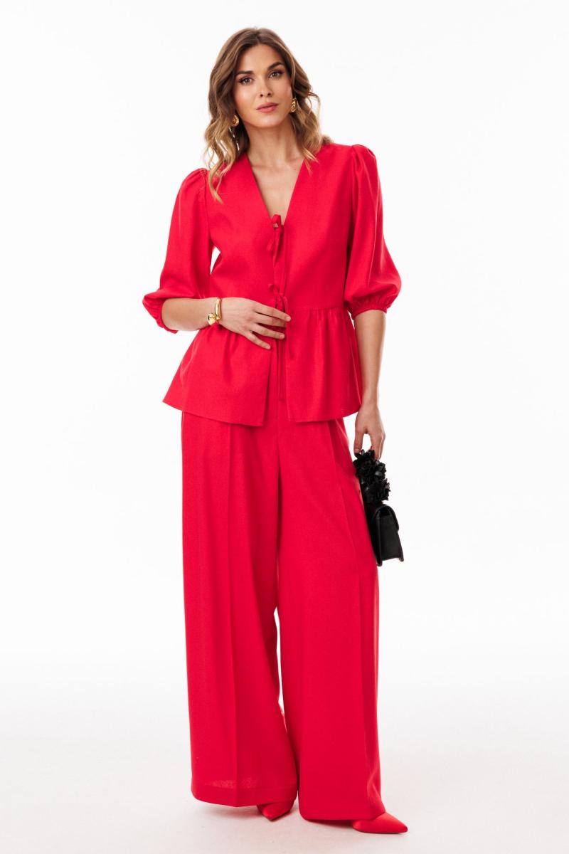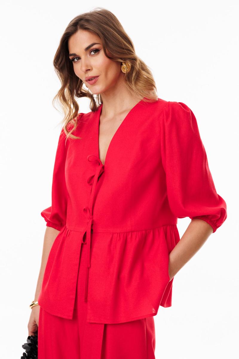 Блузка выполнена из льна. Блузка полуприлегающего силуэта, длиной до линии бедер. По переду обработана присборенная баска, рельефы от пройм до баски, открытая центральная застежка встык на две завязки. Горловина спинки округлой формы, переда - V-образной. Плечевой шов заужен. Рукав втачного покроя, одношовный, длиной ниже линии локтя, со сборкой по окату и низу. По низу рукава обработана эластичная тесьма. Перед и спинка на притачной по низу подкладке.