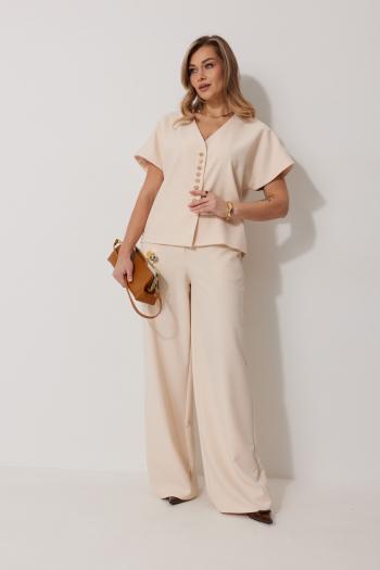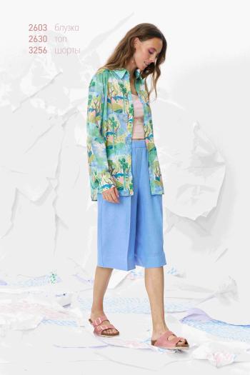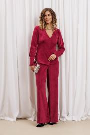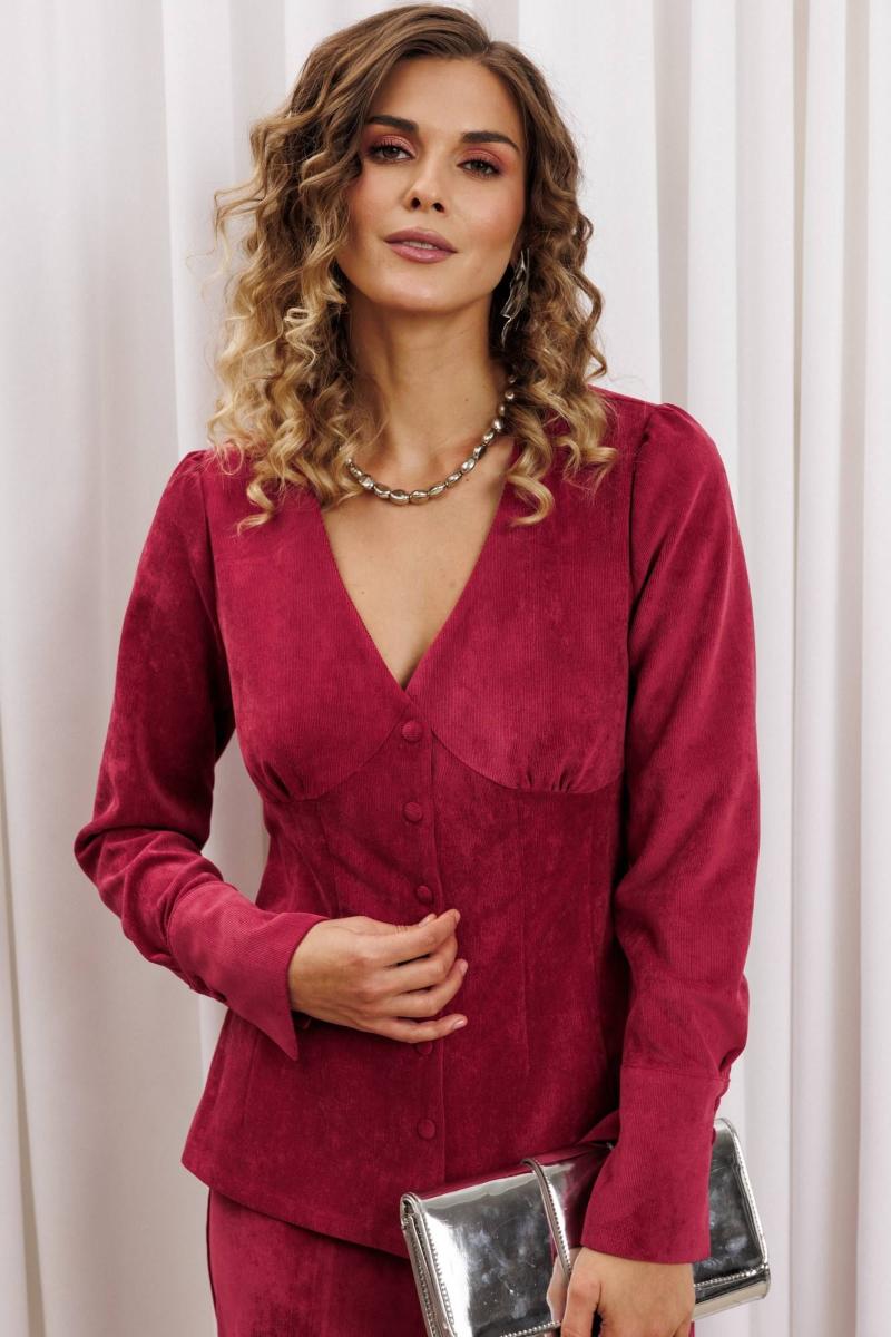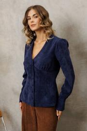 Блузка оригинальная приталенного силуэта из вельветовой ткани. Перед с подрезом под грудью, сборкой в районе груди и талиевыми вытачками. Затсежка на петли и пуговицы. Горловина V-образной формы. Спинка со средним швом и талиевыми вытачками. Рукав втачной со сборкой по окату и с манжетой по низу. Манжета высокая с двумя петлями и пуговицами. Длина блузки - 63 см, длина рукава блузки - 64 см.