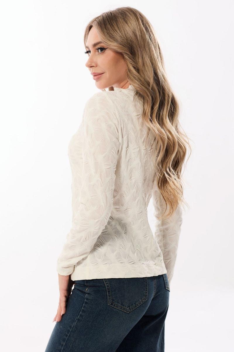Блузка с фигурным вырезом горловины и фантазийным перекрутом по горловине переда, застежкой на потайную молнию в среднем шве спинки. Рукав втачной, длинный.