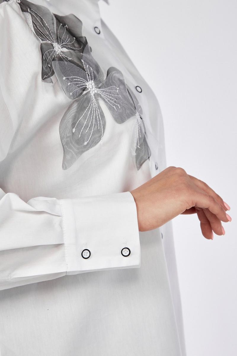 Блузка женская свободного силуэта из блузочной ткани. Воротник стояче-отложной, застежка на петли и пуговицы. На спинке кокетка и складка. Плечо спущенное, рукав длинный со складками, внизу высокий манжет с застежкой на петли и пуговицы. Блузка с фигурной линией низа. Декор — вышивка-аппликация из органзы.