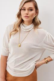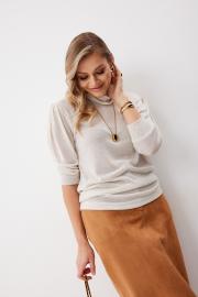 Блуза женская прямого силуэта из трикотажной ткани длиной ниже линии бедра. Горловина обработана отложной стойкой. Рукав ¾ втачной одношовный. По верху рукава заложены складки, по низу рукава притачная манжета. Длина спинки изделия 70,5 см, длина на рукава 48 см.