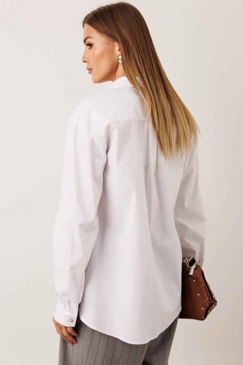 Блузка из хлопковой ткани: – прямой силуэт – асимметричная застёжка – по переду — накладной карман – в планку вставлена тесьма с декоративными жемчужными бусинами – рукав длинный с манжетой и застёжкой на пуговицу