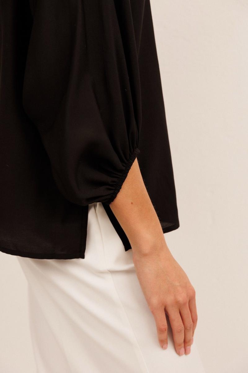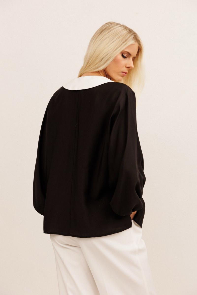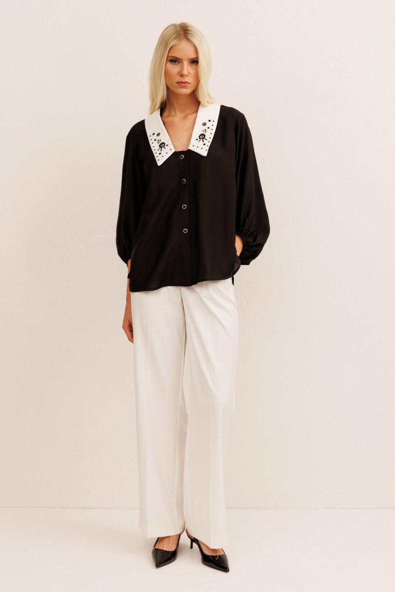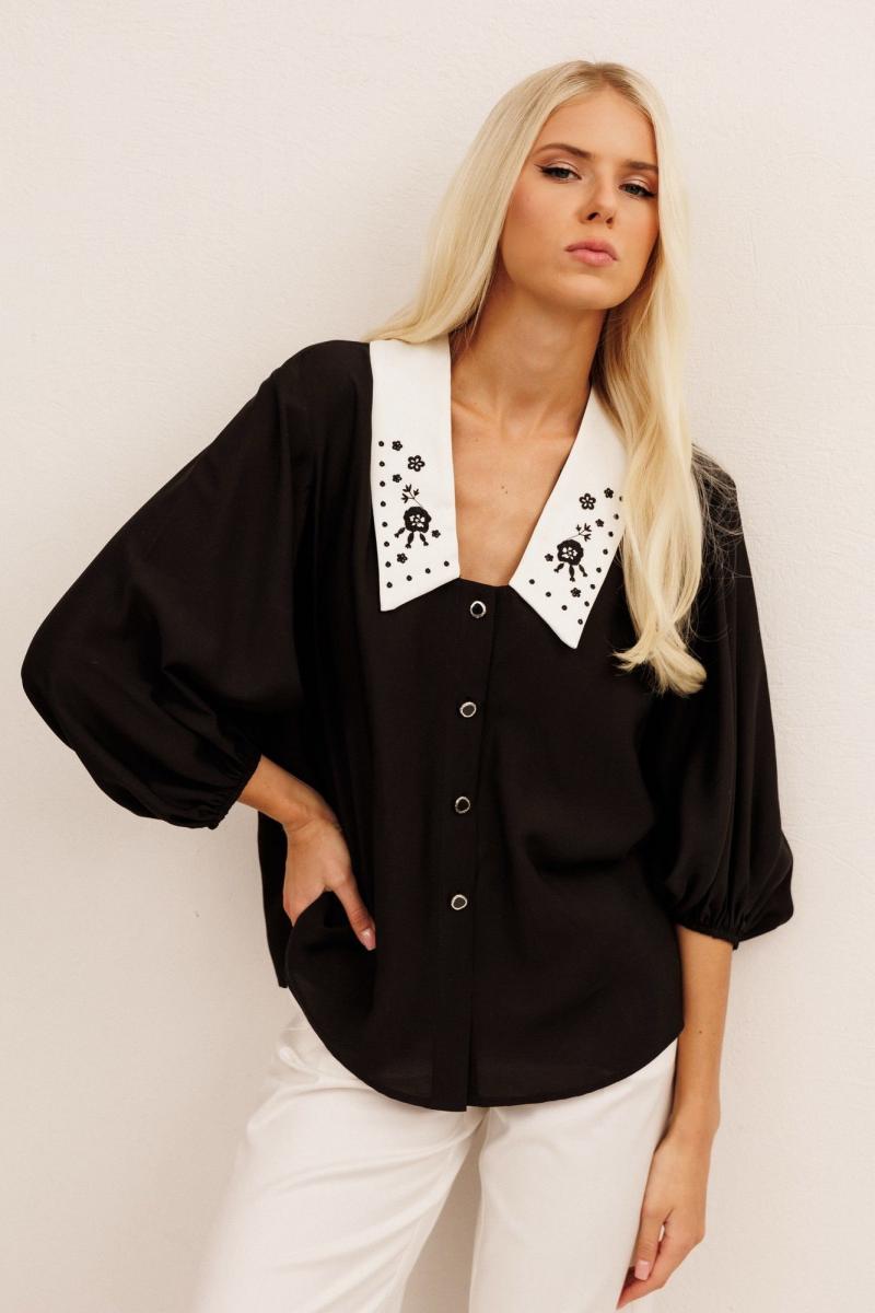 Блузка: - прямой силуэт - лёгкая струящаяся ткань - застёжка на пуговицы - съёмный воротник с дизайнерской вышивкой - объёмные рукава - низ рукава на резинке