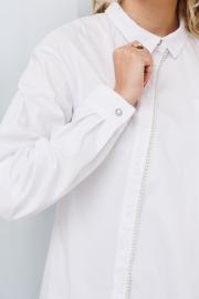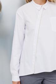 Блузка прямого кроя с асимметричной застежкой. По переду расположен накладной карман. В планку вставлена тесьма с декоративными жемчужными бусинами. Рукав длинный.