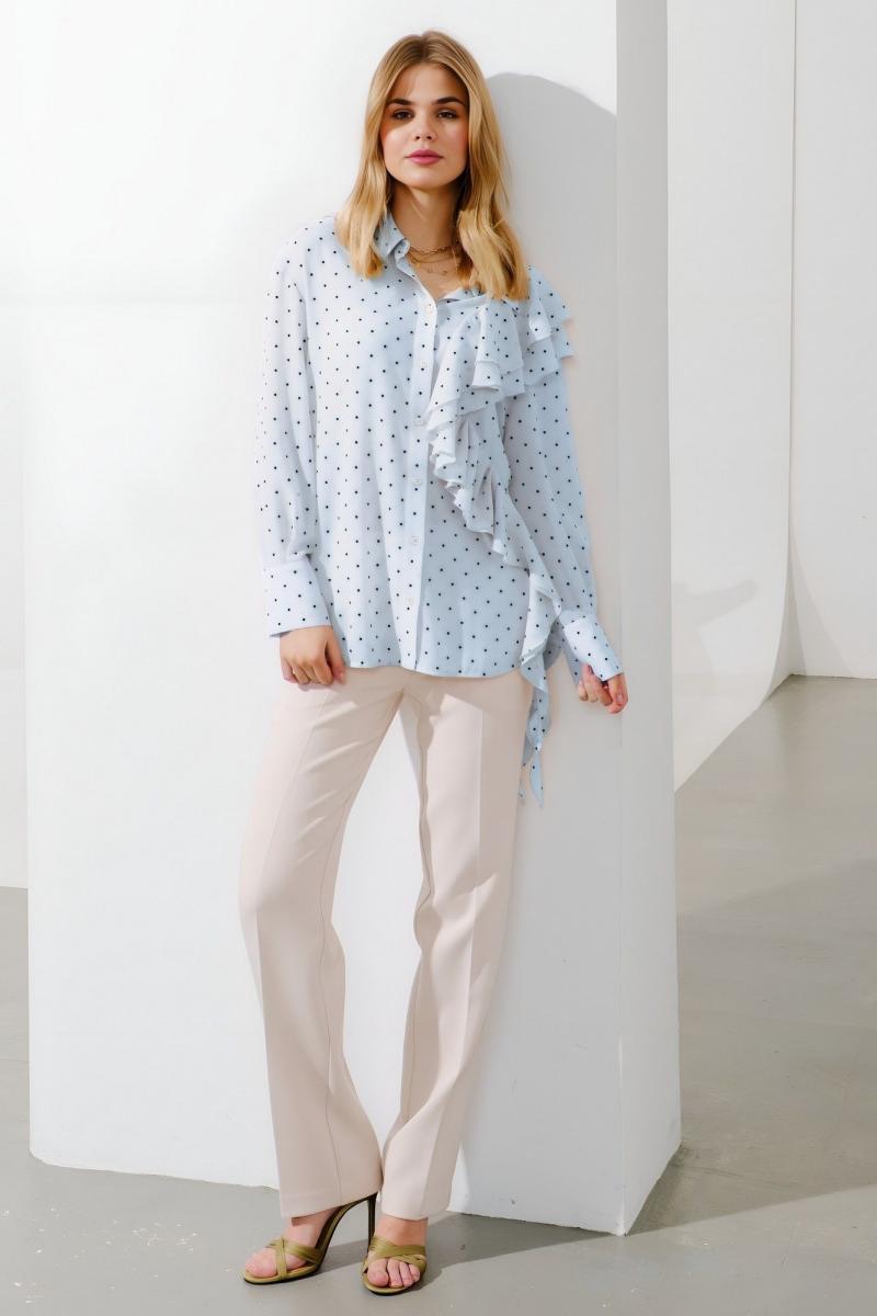 Блуза свободного кроя. Рукав длинный, линия плеча спущена. По низу рукава притачная манжета на застёжку петли и пуговицы. Воротник рубашечного кроя на стойке, застёжка центральная на петли и пуговицы. По переду левой половины блузы и на спинке фигурные рельефы, в которые вшиты по два волана. Длина по спинке: 77 см Длина рукава: 57 см ОГ: 114-118-122-126-130 см (размер 42-44-46-48-50)