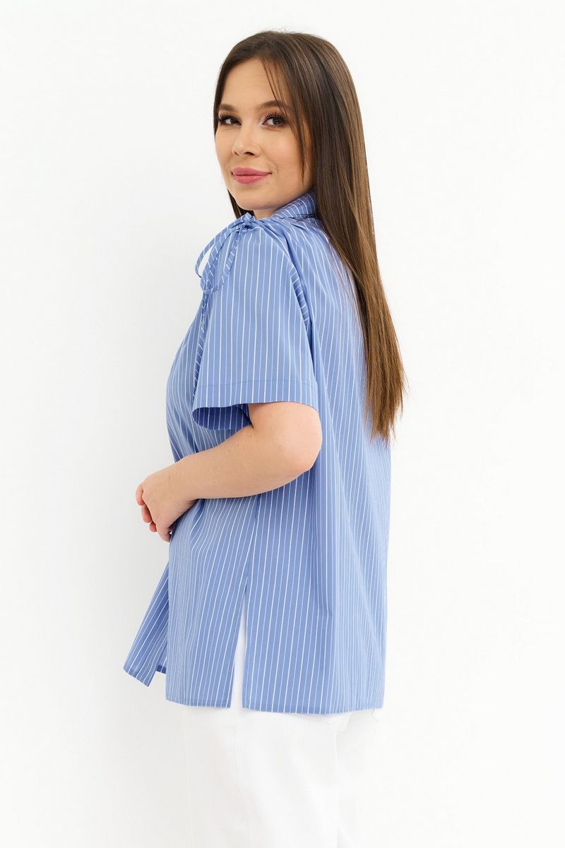Стильная блуза рубашечного кроя с центральной застежкой на пришивные пуговицы, скрытые планкой из основной ткани. Рукав втачной. По плечу декоративная сборка на шнурок, выполненный из основной ткани. Воротник отложной на стойке. Длина блузы от плечевого шва 73см. Длина рукава 25см.