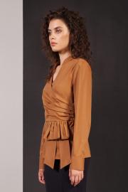 Элегантная блузка приталенного силуэта из стрейчевой хлопковой ткани ,отрезная по талии. Горловина с притачной стойкой и V образным вырезом. Полочки блузки на запах и со складками по левому боковому шву. По талии втачной бант. Рукава втачные длинные с высокими притачными манжентами, застёгивающимися на навесные петли и пуговицы-бусины в цвет ткани. Застёжка на потайную. Молнию по боковому шву.
