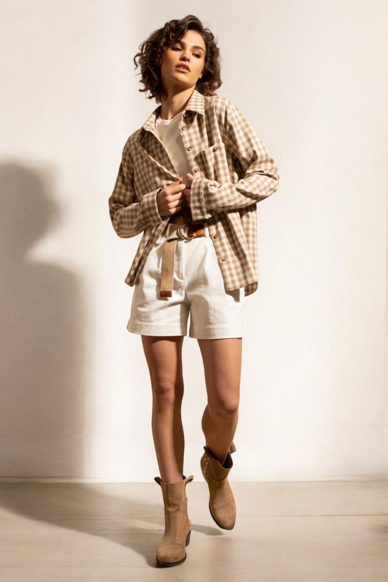 Рубашка с дизайном в клетку, свободного прямого силуэта со слегка спущенной линией проймы. Застежка на цельнокроеную планку с отделочными пуговицами. Воротник отложной рубашечного типа на отрезной стойке. Рукава втачные длинные с притачными манжетами с застежкой на пуговицы. По переду 1 накладной карман. Спинка со встречной складкой. Низ фигурный.