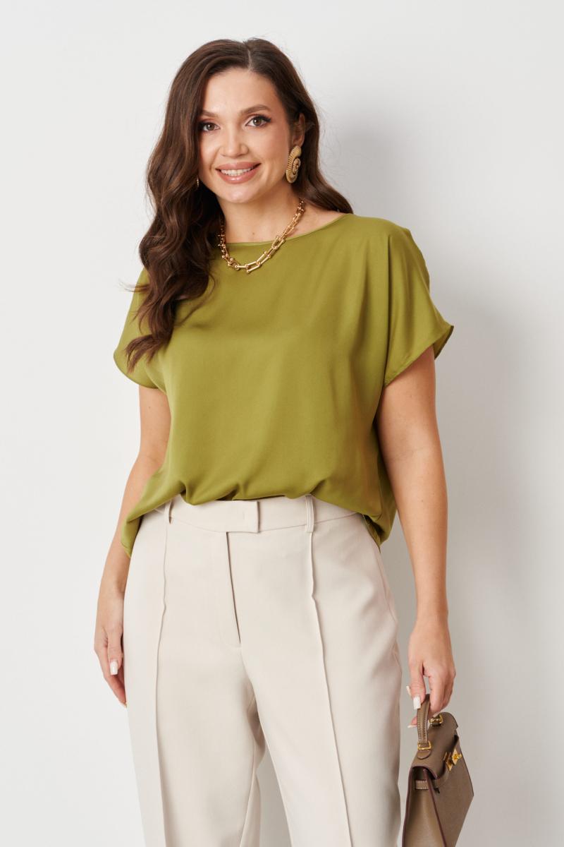 Эта женская базовая блуза прямого силуэта оливкового оттенка — стильный выбор для вашего гардероба. Она отлично сочетается с юбками, брюками и джинсами, создавая разнообразные образы для повседневной носки. Легкая и комфортная, блуза выполнена из приятной на ощупь ткани с гладкой поверхностью, которая не парит даже в жаркую погоду. Свободный крой с опущенной линией плеча и короткими цельнокроеными рукавами обеспечивает безупречную посадку и комфорт. Обработанная узкой планкой горловина придает изделию аккуратный вид. Ее легко стирать в машинке, она быстро сохнет и сохраняет форму после стирки. Купите эту блузу и создавайте множество стильных образов для любого дня!