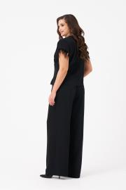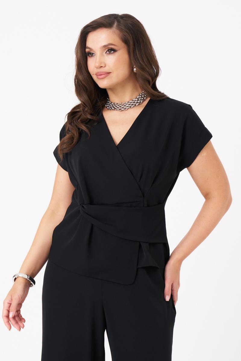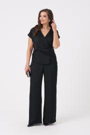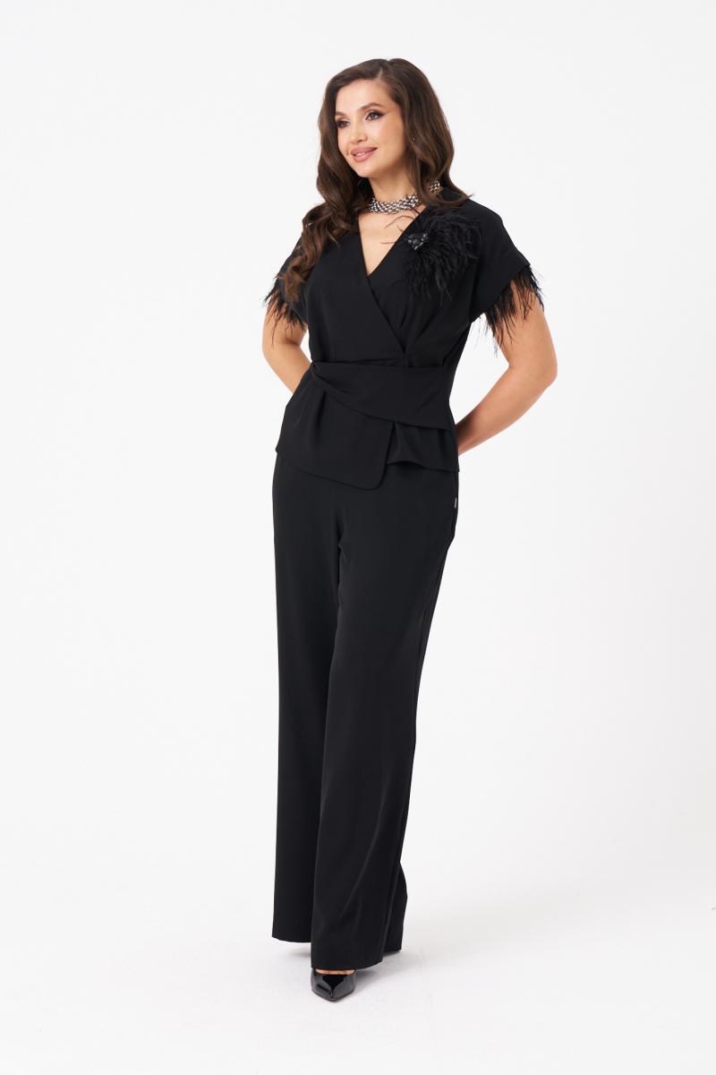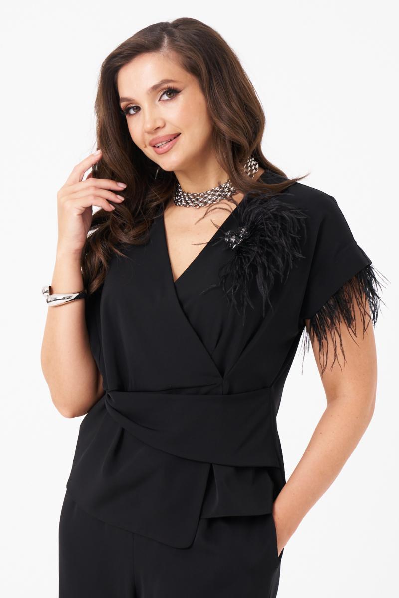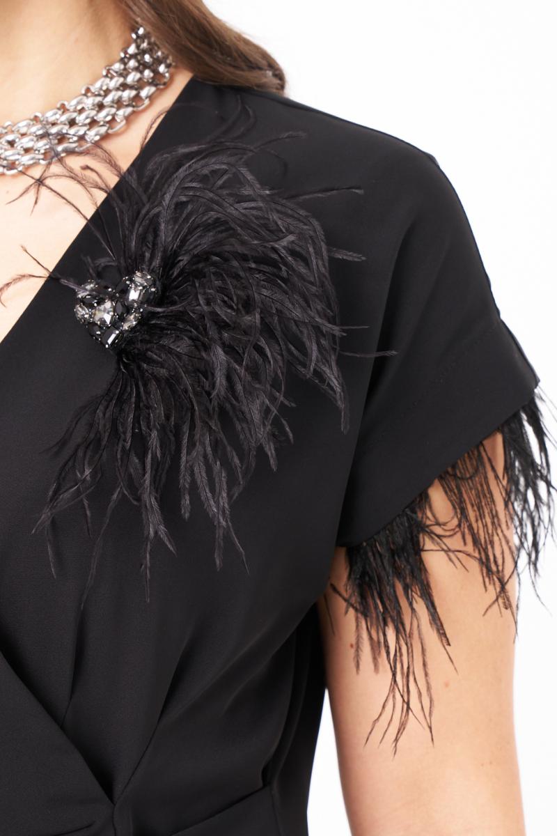Это женская блузка из поливискозной струящейся ткани, подходящая для торжественных мероприятий. Блузка полуприлегающего силуэта. Блузка отрезная по линии талии. Верхняя часть блузки на запах с небольшими складками, а также имеется рельеф, идущий от линии плеча до отрезной линии по талии. Нижняя часть блузки имеет декоративную деталь, а также имитацию баски. Спинка со средним швом. Горловина V-образная. Линия плеча спущенна. Проймы обработаны обтачками и украшены перьями. Которые крепятся на тесьму с кнопками и есть возможность их остегнуть при необходимости либо для стирки блузки. За счёт съёмных перьев можно создавать различные образы как для торжественных случаев так и для других мероприятий. В данной блузке вы будете смотреться очень очаровательно ведь она отлично подчеркнет все ваши достоинства и скроет имеющиеся недостатки.
