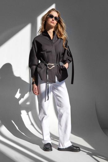 Блузка женская из смесовой ткани c большим содержанием хлопка для повседневной носки. Блузка прямого силуэта. Перед имеет дизайнерскую вышивку в виде листиков. Застежка на обметанные петли и пуговицы. Спинка имеет кокетку и складку. Горловина обработана рубашечным воротником с отрезной стойкой. Линия плеча спущена. Рукава втачные длинные, низ рукава обработан притачной манжетой с застежкой на обметанную петлю и пуговицу. Такой креативный вариант блузки обязательно привлечет к вам внимание. Блузка станет вашей любимой вещью в гардеробе.