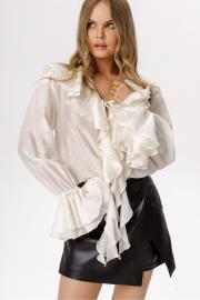 Полупрозрачная блуза из тенсела с воланами (приобрести брюки с фото можно по арт. 6557, приобрести шорты с фото можно по арт. 6564). Детали: блуза прямого силуэта, V-образный вырез горловины, воротник-волан, низ рукавов на эластичной тесьме с воланами, завязки по переду. Длина по спинке около 61 см в размерах 40-46, 64 см в размерах 48-52, длина рукава с воланом около 60 см