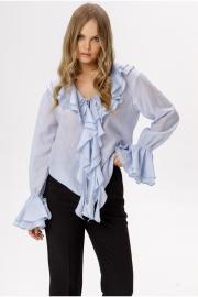 Полупрозрачная блуза из тенсела с воланами (приобрести брюки с фото можно по арт. 6557, приобрести шорты с фото можно по арт. 6564). Детали: блуза прямого силуэта, V-образный вырез горловины, воротник-волан, низ рукавов на эластичной тесьме с воланами, завязки по переду. Длина по спинке около 61 см в размерах 40-46, 64 см в размерах 48-52, длина рукава с воланом около 60 см