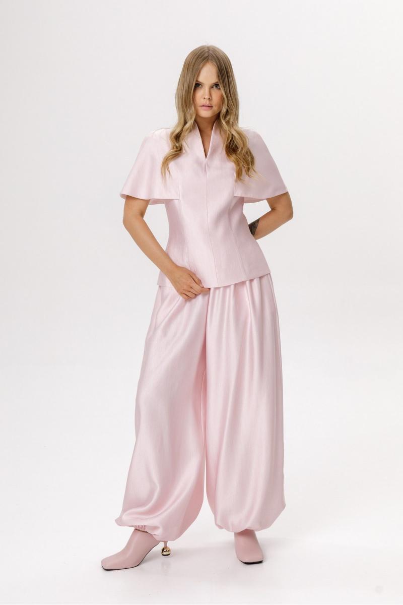 Блуза приталенного силуэта и цельнокроеной пелериной (приобрести брюки с фото можно по арт. 6671). Детали: прилегающий силуэт, талиевые вытачки по переду и спинке, цельнокроеная горловина стойка, потайная молния в среднем шве спинки, блуза на подкладке. Длина блузы по спинке около 62 см в размерах 40-46, около 65 см в 48-52.
