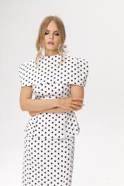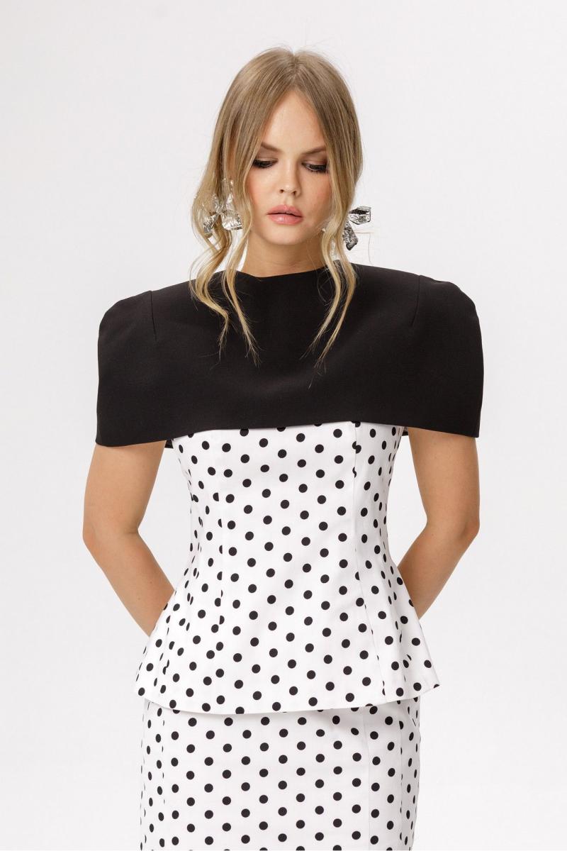 Приталенная блуза с укороченным кейпом. Детали: блуза прилегающего силуэта, кареобразный вырез горловины переда и спинки, рельефные швы, потайная застежка по спинке, на подкладке. Кейп с круглой горловиной и вытачками по плечам, плечевые накладки, застежка на навесную петлю и пуговицу, на подкладке. Кейп не имеет переда и спинки. Длина топа по боковому шву около 56 см в размерах 40-46, около 58,5 см в размерах 48-52. Длина кейпа около 21 см в 40 размере, около 22 см размерах 42-46 и около 23 см в размерах 48-52