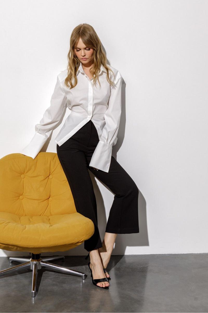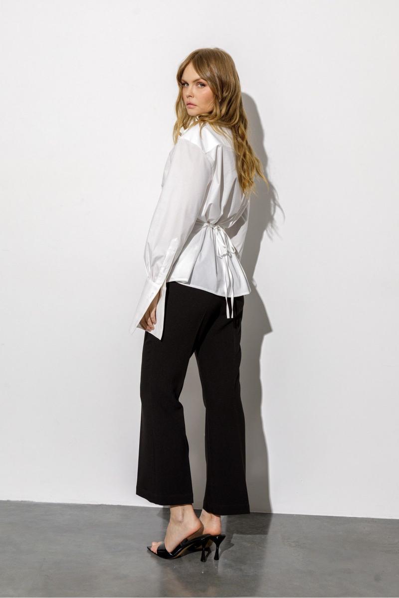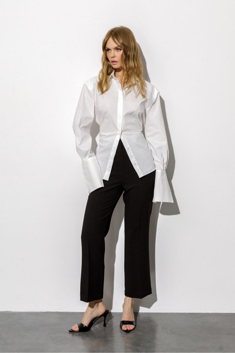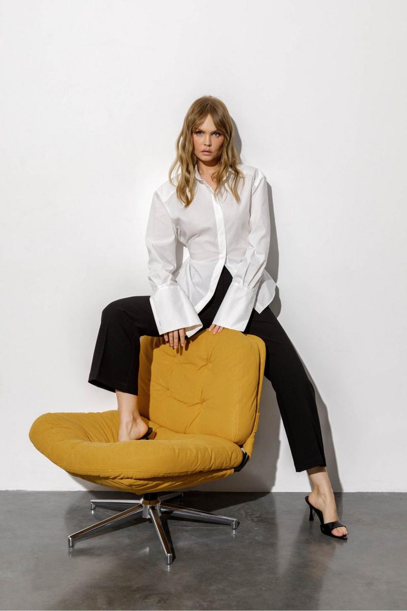 Рубашка со шнуровкой по талии из хлопка (приобрести брюки с фото можно по арт. 6557). Детали: приталенный силуэт, расширенная линия плеча, кокетка по переду и спинке, длинный рукав с широкой притачной манжетой, рубашечный воротник, центральная потайная застёжка на 7 пуговиц, петли в боковых швах. Длина по спинке около 67 см в размерах 40-46 и около 70 см в размерах 48-52, длина рукава с манжетой около 64 см