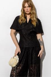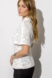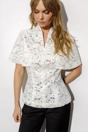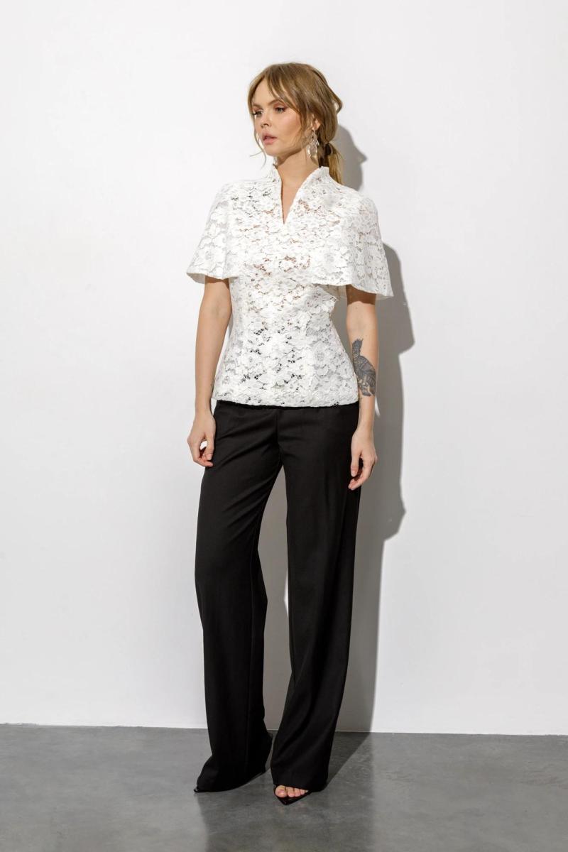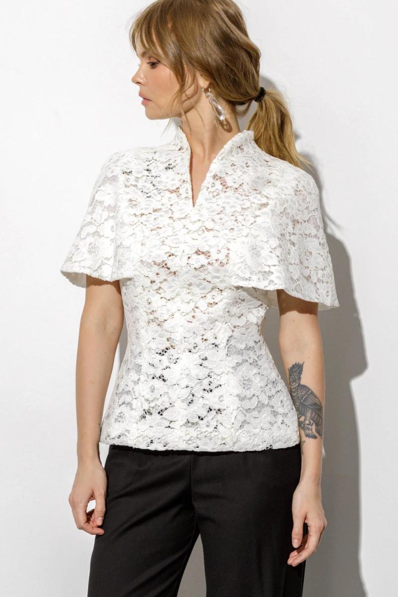 Кружевная блуза-кейп приталенного силуэта и цельнокроеной пелериной. Детали: прилегающий силуэт, талиевые вытачки по переду и спинке, цельнокроеная горловина стойка, потайная молния в среднем шве спинки, подкладка- 100% хлопок. Длина по спинке около 62 см в размерах 40-46, около 65 см в 48-52