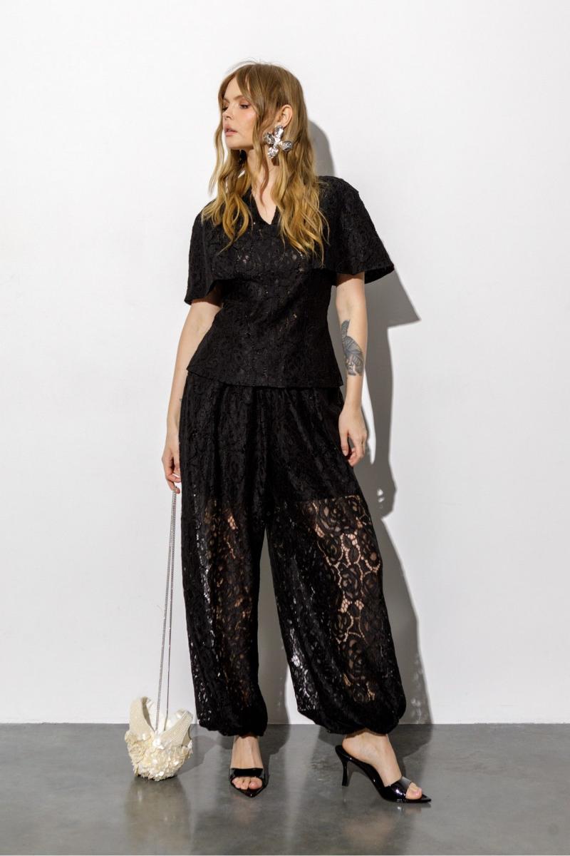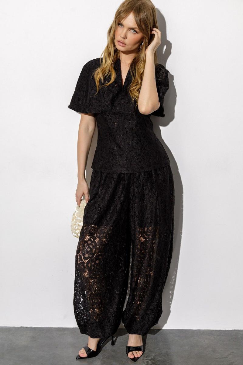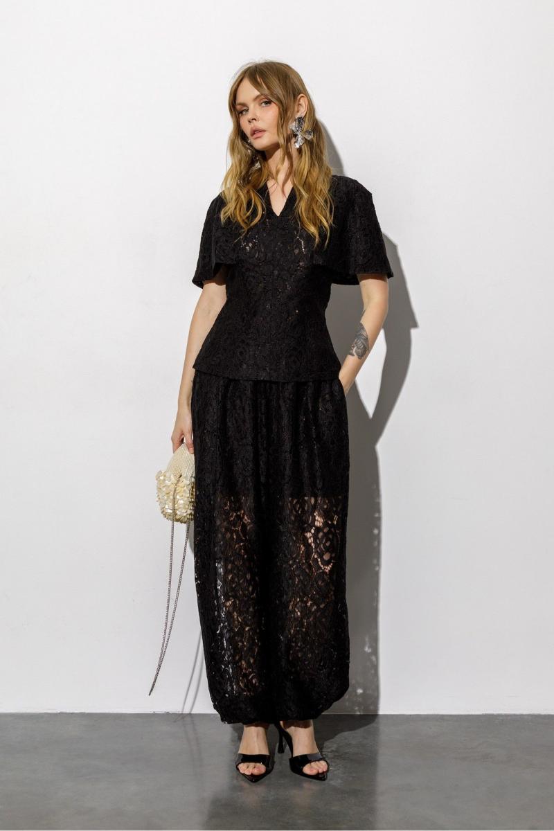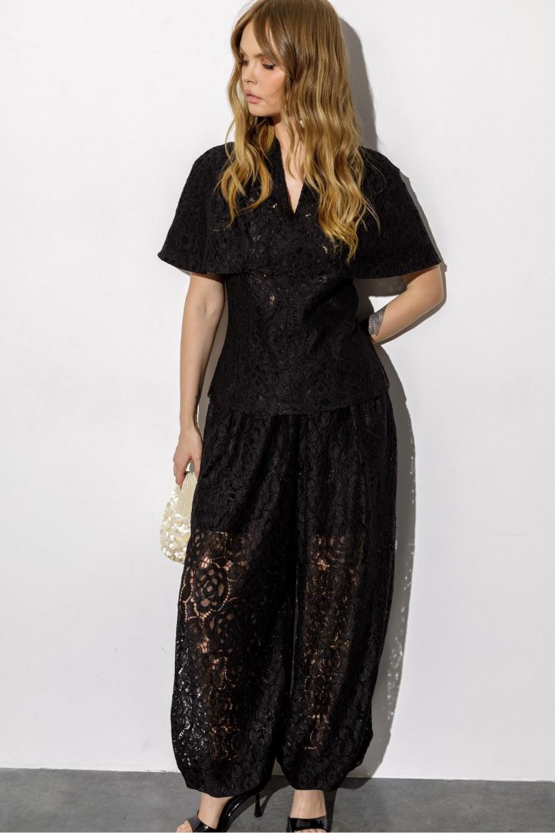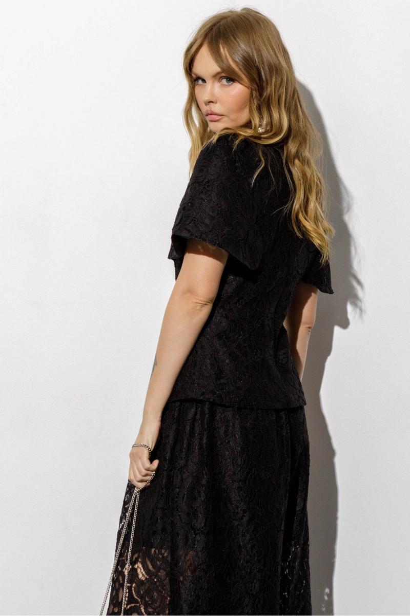 Кружевная блуза-кейп приталенного силуэта и цельнокроеной пелериной. Детали: прилегающий силуэт, талиевые вытачки по переду и спинке, цельнокроеная горловина стойка, потайная молния в среднем шве спинки, подкладка- 100% хлопок. Длина по спинке около 62 см в размерах 40-46, около 65 см в 48-52