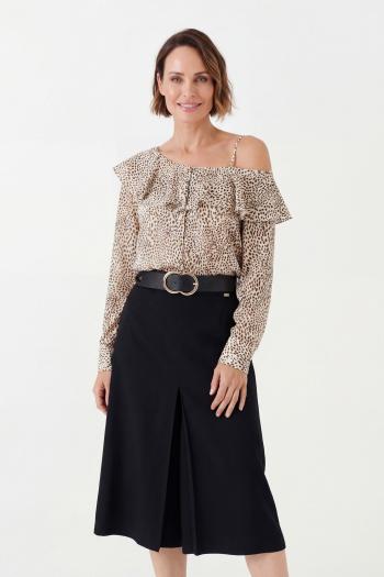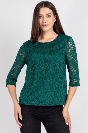 Блузка полуприлегающего силуэта, на запах, длиной до талии. Спинка с небольшой сборкой по шву притачивания к поясу. Перед с односторонними складками. По низу блузки притачной пояс с отлетными концами. Рукава одношовные, втачные, длинные. По низу рукава обработан разрез, складка и притачная манжета, которая застегивается на петлю и пуговицу. По горловине обработан рубашечный воротник на отрезной стойке. В правом боковом обработана застежка на потайную тесьму-«молнию».