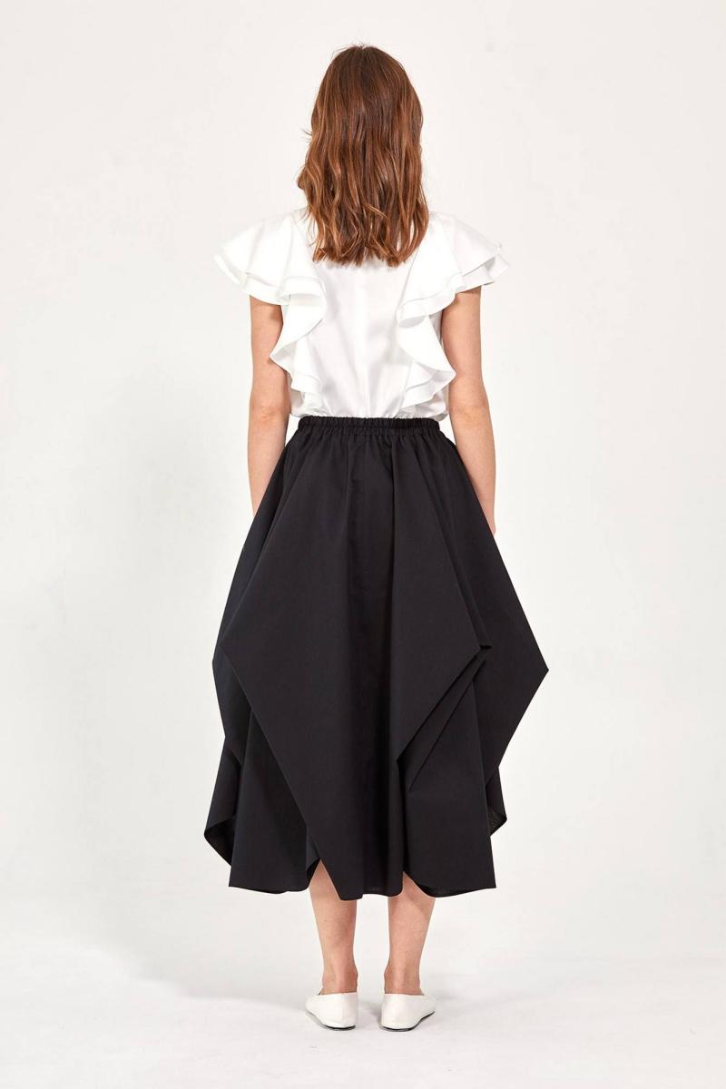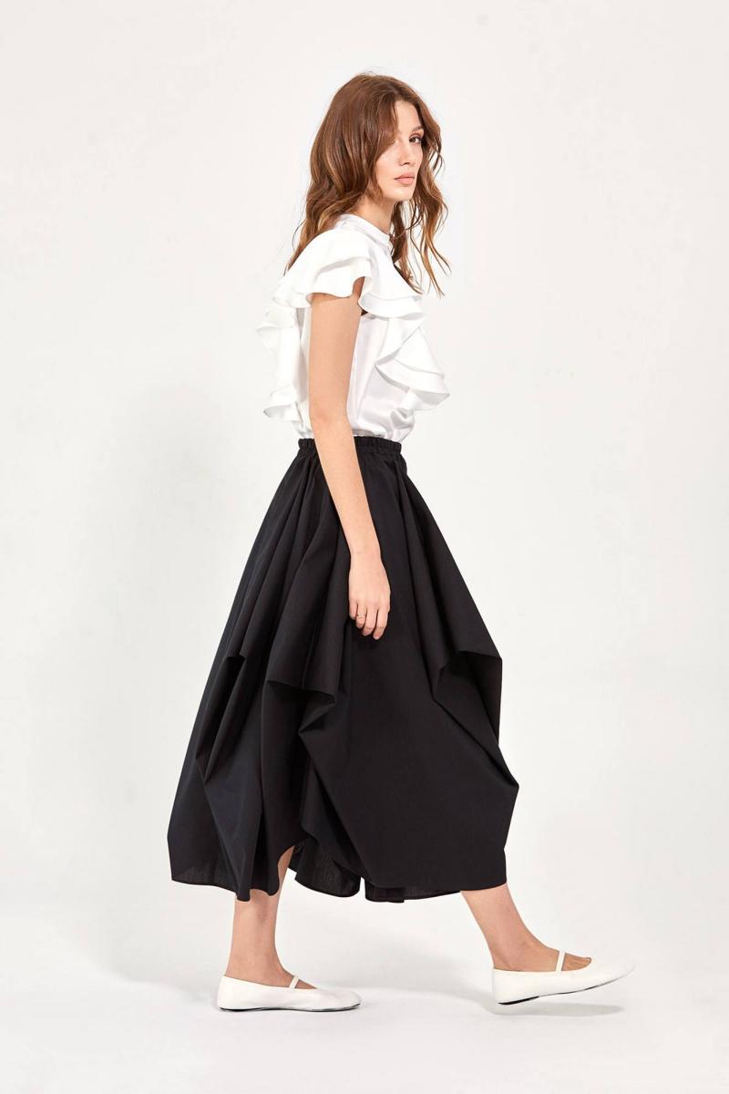 Блуза: - прямой силуэт - спереди и на спине прямые рельефы, в которые вставлены двухслойные воланы -спинка со средним швом, сверху которого разрез и застёжка на пуговицу и навесную петлю -воротник стойка - проймы обработаны бейкой