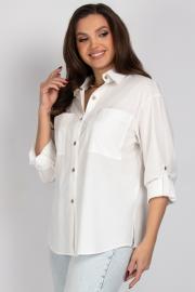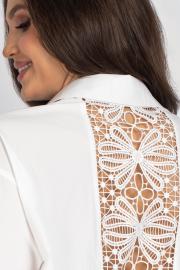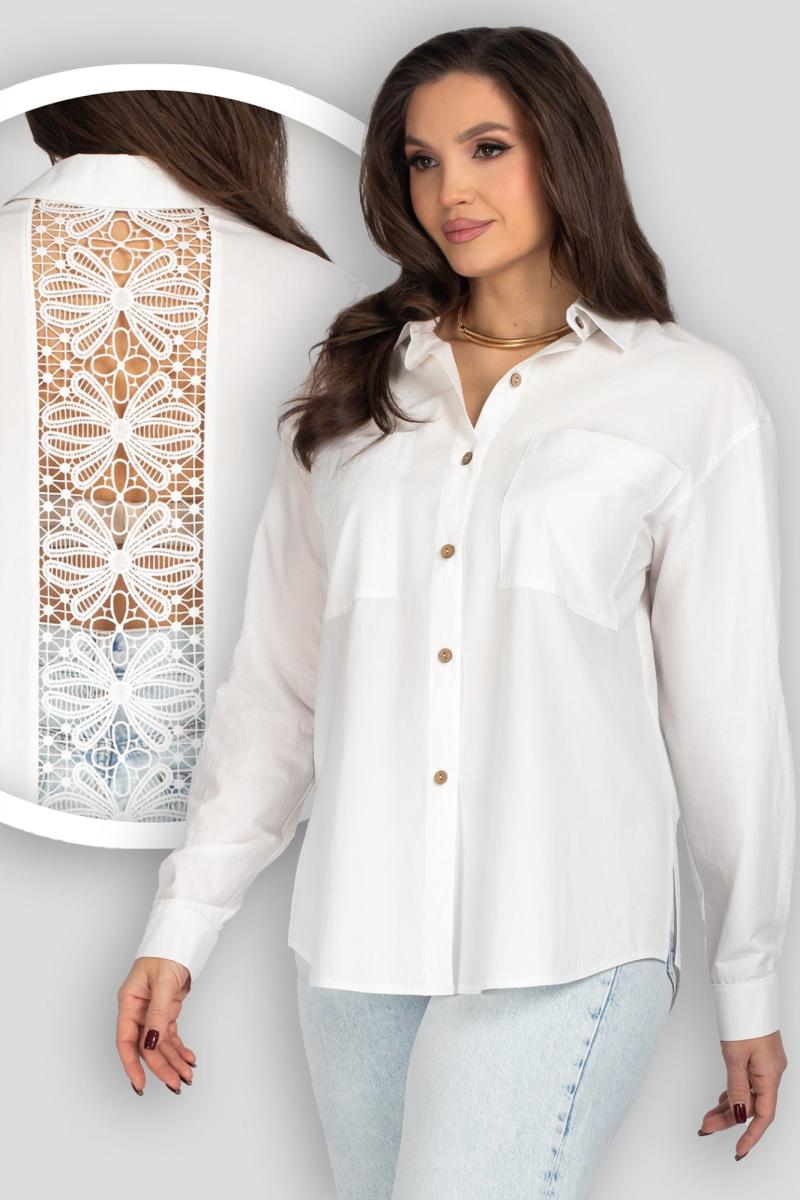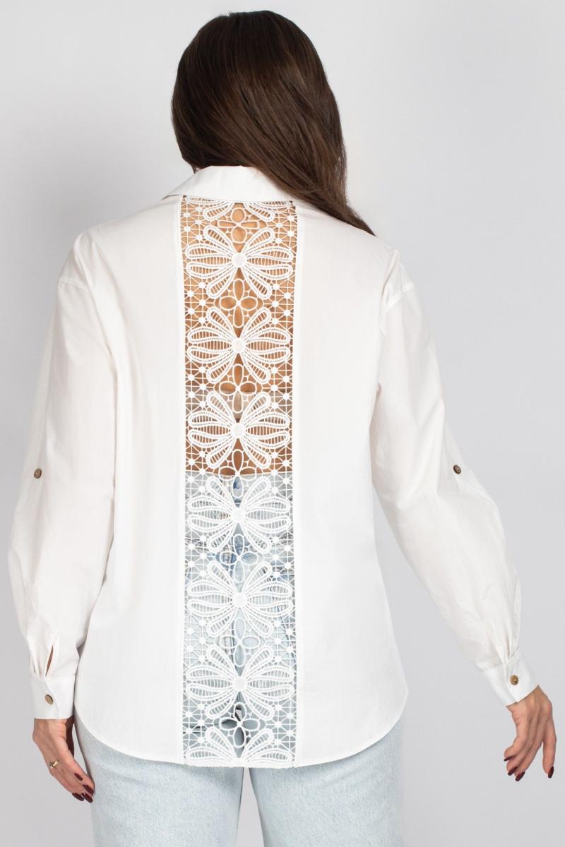 Женская блузка (рубашка) прямого силуэта со спущенным плечом. Передняя часть блузки состоит из двух частей, с центральной бортовой застежкой на 6 петель и пуговиц и настроченными карманами. Спинка украшена вставкой из кружева. Рукава имеют нашитую пату с пуговицей и притачную манжету, которая застегивается на одну петлю и пуговицу. Воротник рубашечного типа с отрезной стойкой. Уход: бережная стирка при температуре не выше 30°С.