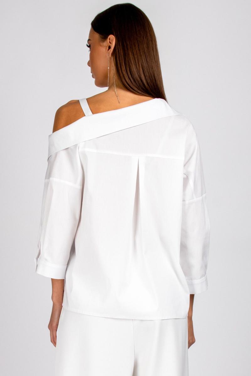 Блузка прямого силуэта со спущенным плечом. Горловина ассиметричная с воротником и бретелей на левом плече. Перед с косой застежкой на 6 петель и 7 пуговиц. Спинка с кокеткой и встречной складкой. Рукав 3/4 с манжетой на 1 петлю и пуговицу. Уход: бережная стирка при температуре не выше 30°С. "