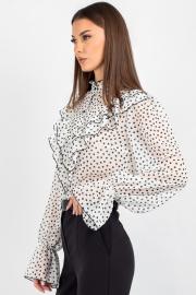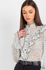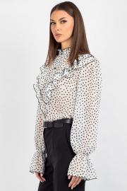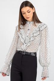 Спинка блузки выполнена цельной. Втачной рукав со сборкой по окату подчёркивает линию плеча и придаёт силуэту мягкость, а присборенная на эластичную тесьму нижняя часть рукава создаёт изящный акцент и обеспечивает комфортную посадку на запястье. Завершает дизайн горловина со стойкой и рюшей — этот элемент делает образ более нарядным.