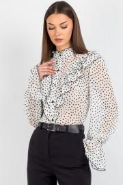 Шифоновая блузка с принтом — это воплощение лёгкости и женственности. Передняя часть изделия оформлена центральной бортовой застёжкой на 8 петель и пуговиц: это не только обеспечивает удобство ношения, но и придаёт модели классический шарм. Нагрудные выточки и кокетка создают безупречную посадку по фигуре, а вставленные в шов кокетки рюши добавляют романтичности и утончённости.