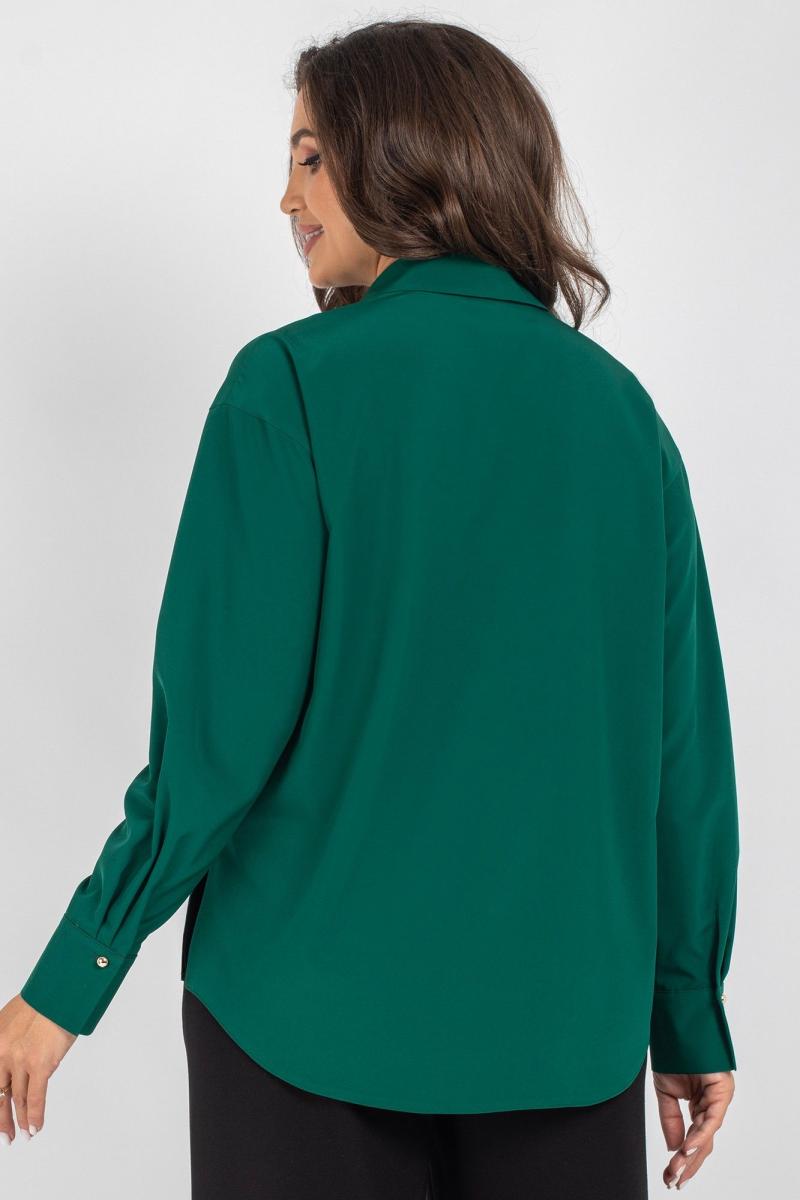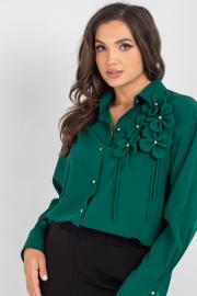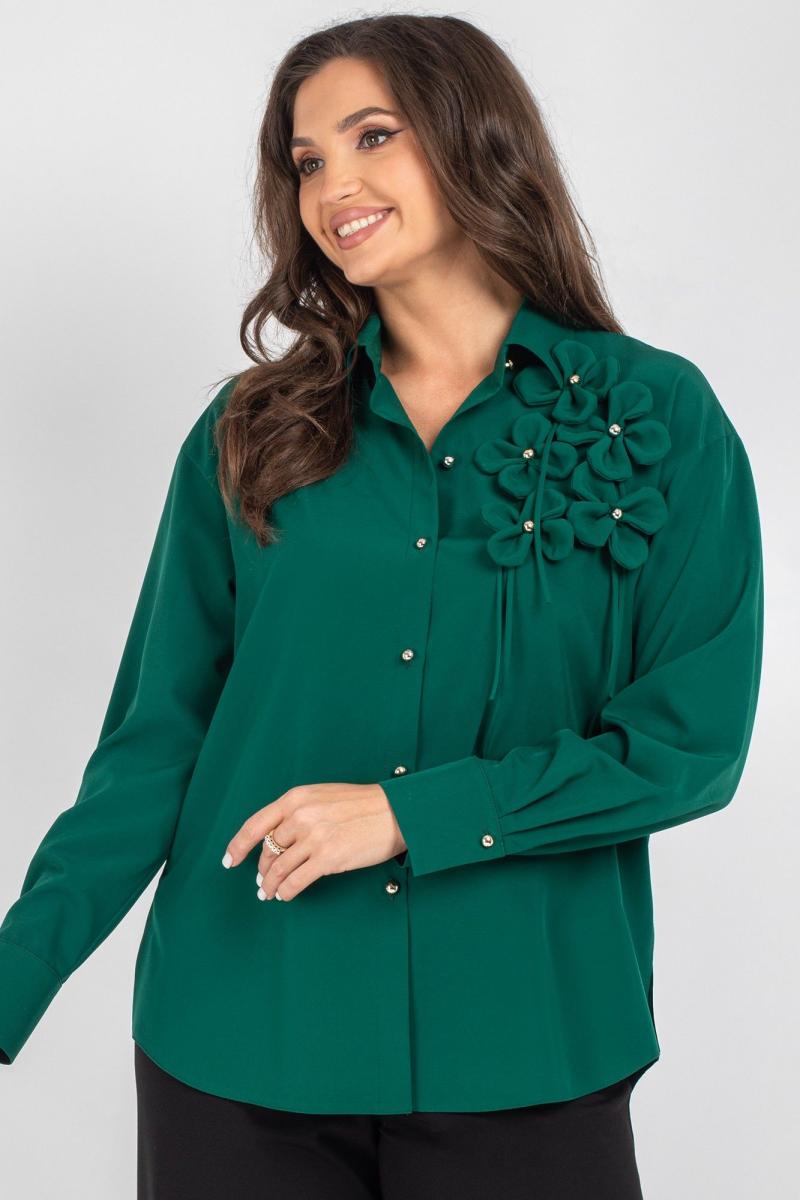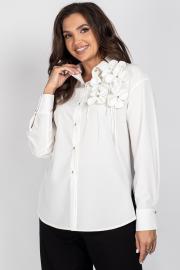 Блузка женская, прямого силуэта со спущенным плечом.  Перед из двух частей с центральной бортовой застежкой на 6 петель и пуговицу. Отделочным элементом блузки является 5 цветков, настроченные пуговицами.  Спинка цельная.  Рукав с притачной манжетой, застегивающейся на 1 петлю и пуговицу.  Воротник рубашечного типа с отложной стойкой. Уход: бережная стирка при температуре не выше 30°С.