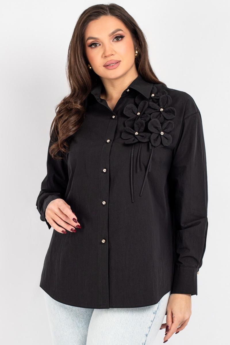 Блузка женская, прямого силуэта со спущенным плечом.  Перед из двух частей с центральной бортовой застежкой на 6 петель и пуговицу. Отделочным элементом блузки является 5 цветков, настроченные пуговицами.  Спинка цельная.  Рукав с притачной манжетой, застегивающейся на 1 петлю и пуговицу.  Воротник рубашечного типа с отложной стойкой. Уход: бережная стирка при температуре не выше 30°С.