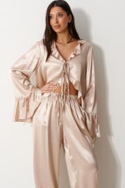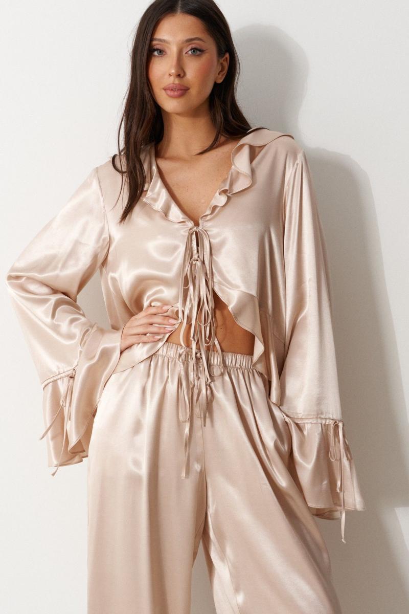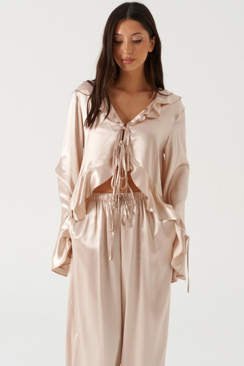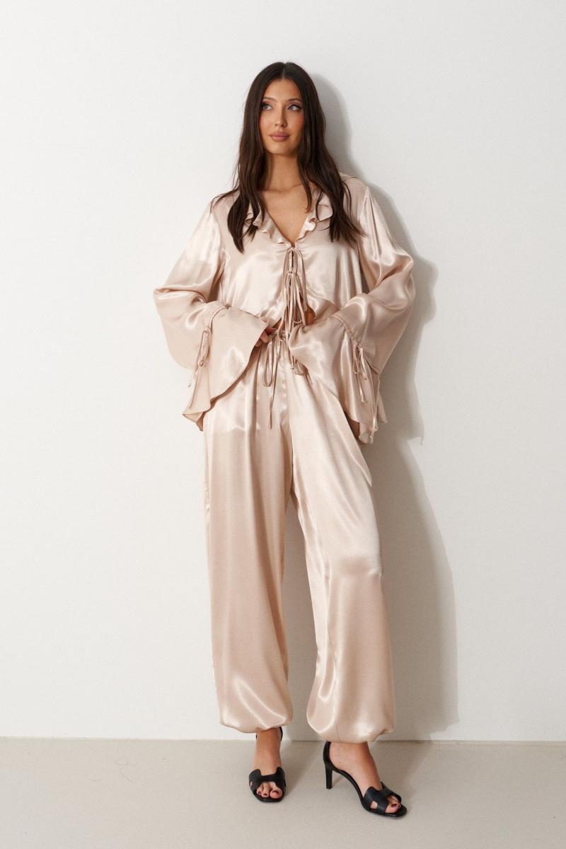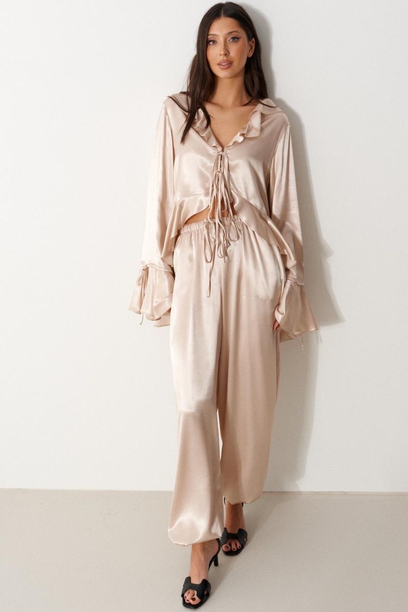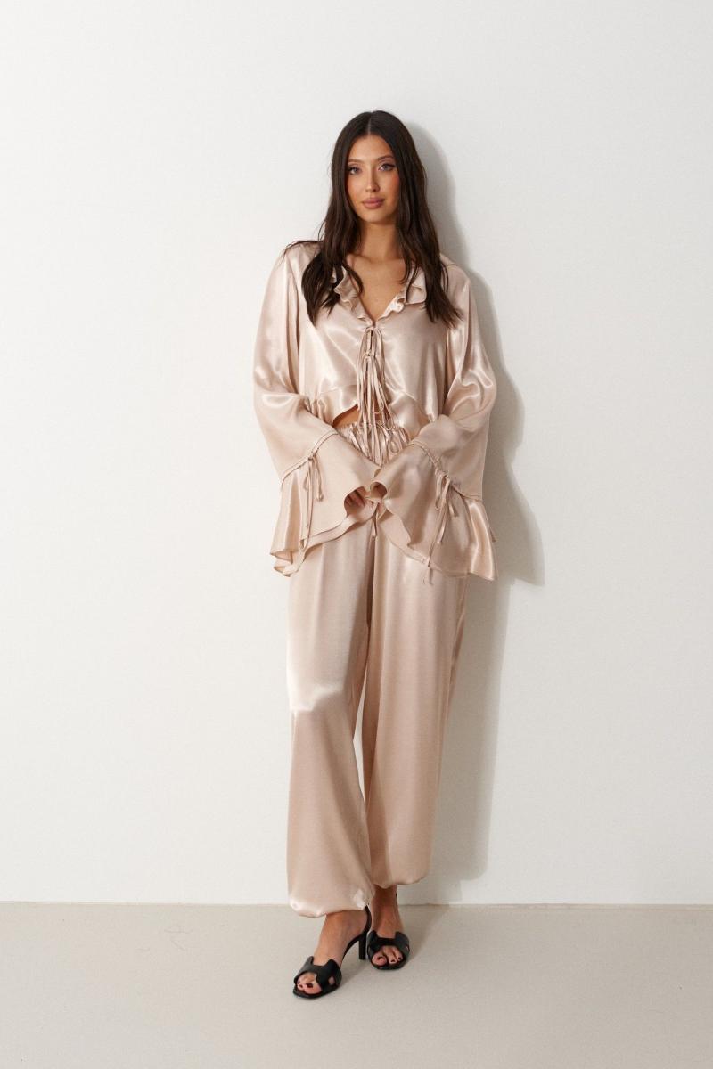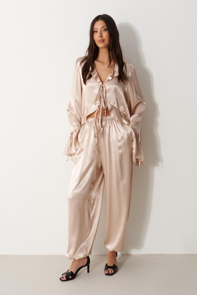 Брюки-джоггеры, выполнены из мягкого струящегося полотна телесного цвета. Характеристики: прямой крой, пояс на резинке, в боковых швах карманы, штанина внизу на резинке с фиксатором. Длина по боковому шву 107 см.